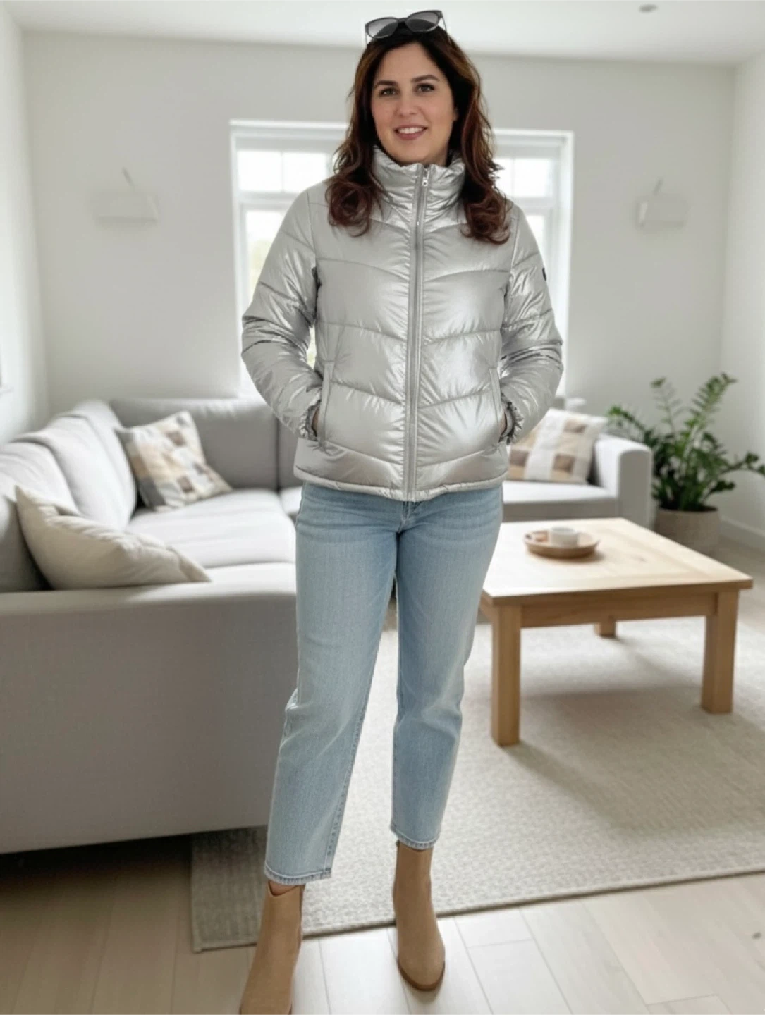Selling a silver puffer jacket! It's in great condition and perfect for the cooler weather. It's a stylish and practical addition to any wardrobe