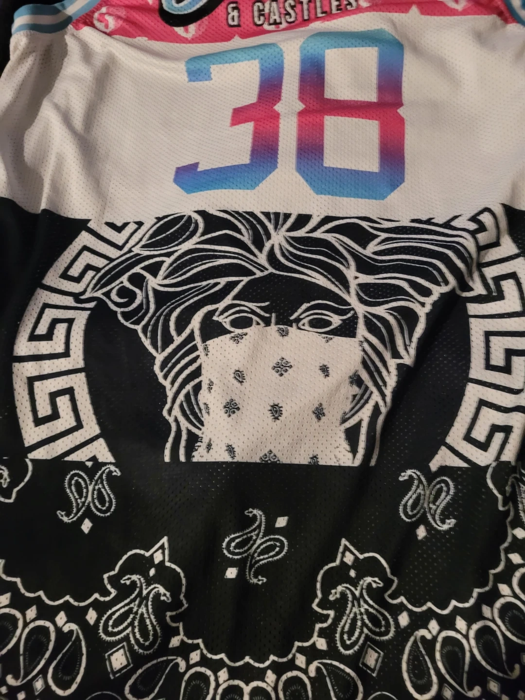 Selling a Crooks & Castles basketball jersey. It's a unique design with the number 38 on the back and a Versace-style graphic on the bottom. Great for adding some flair to your wardrobe!...it's extra large