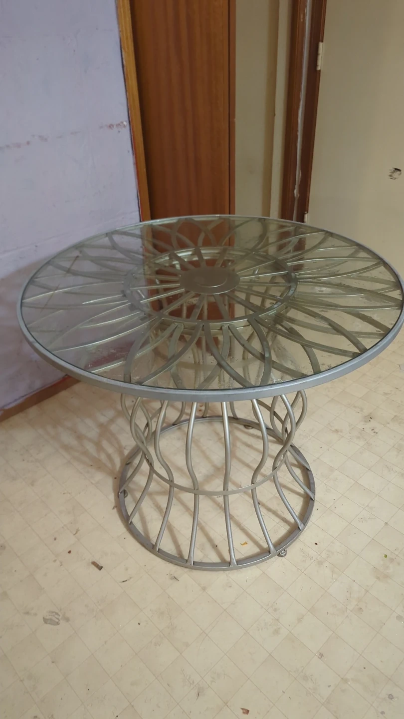 Selling a unique glass top round accent table! It features a decorative metal base (light in weight) and a clear glass top. It's perfect as a side table or a decorative piece in any room. It's in good condition and ready for a new home!
