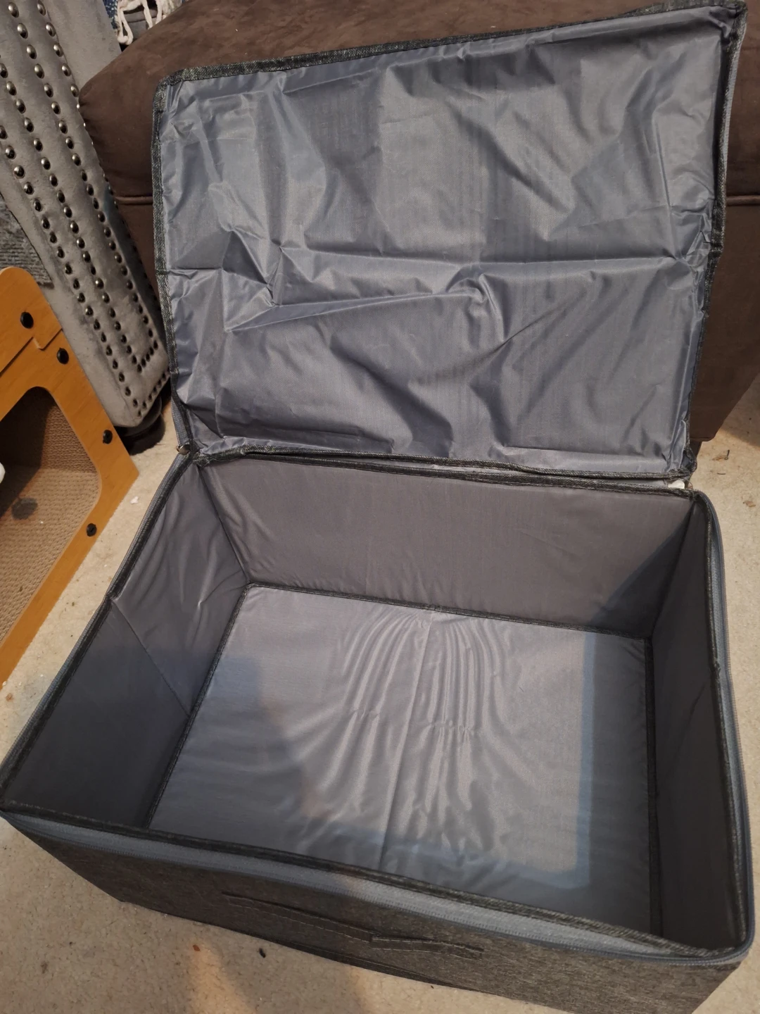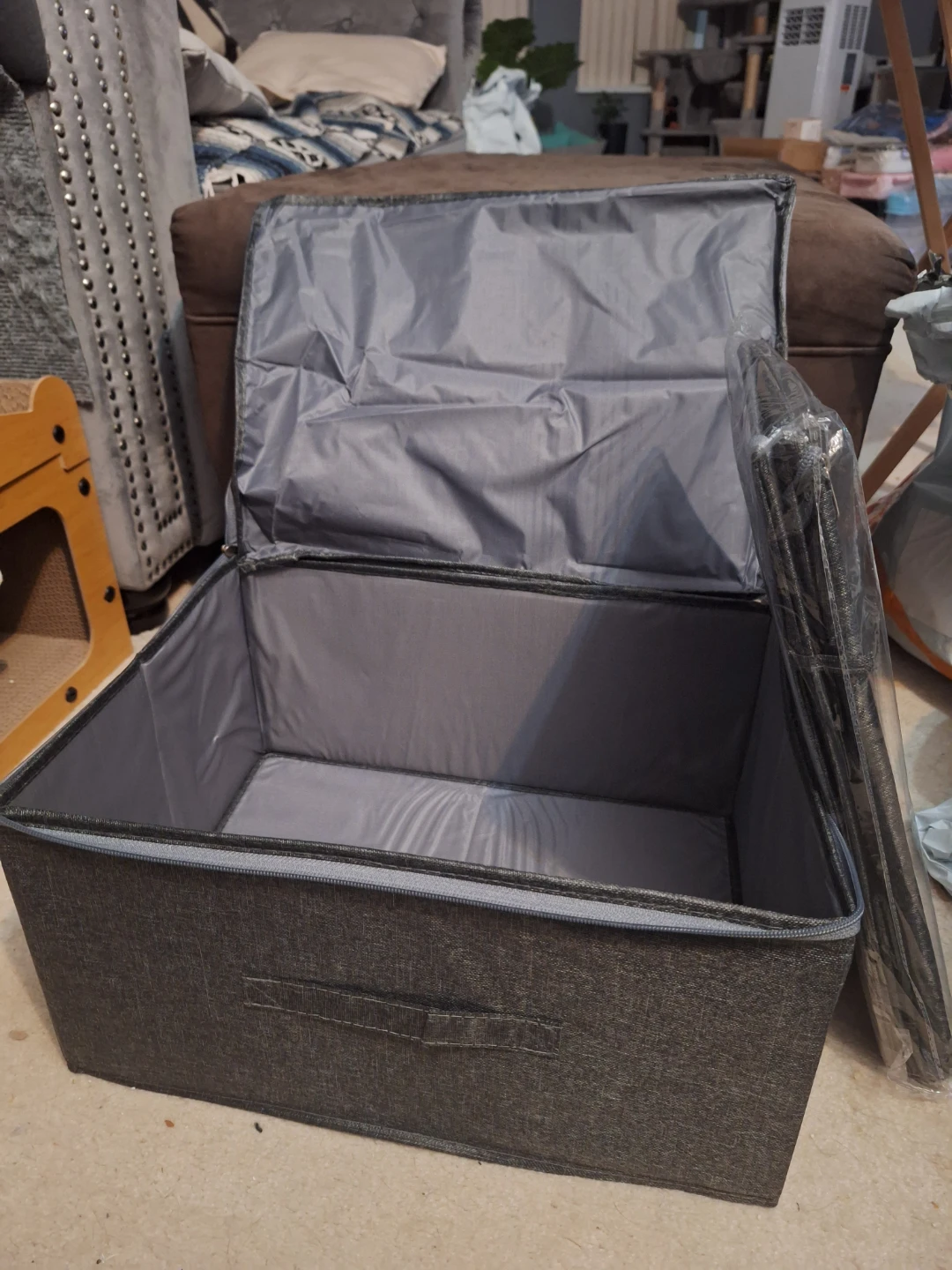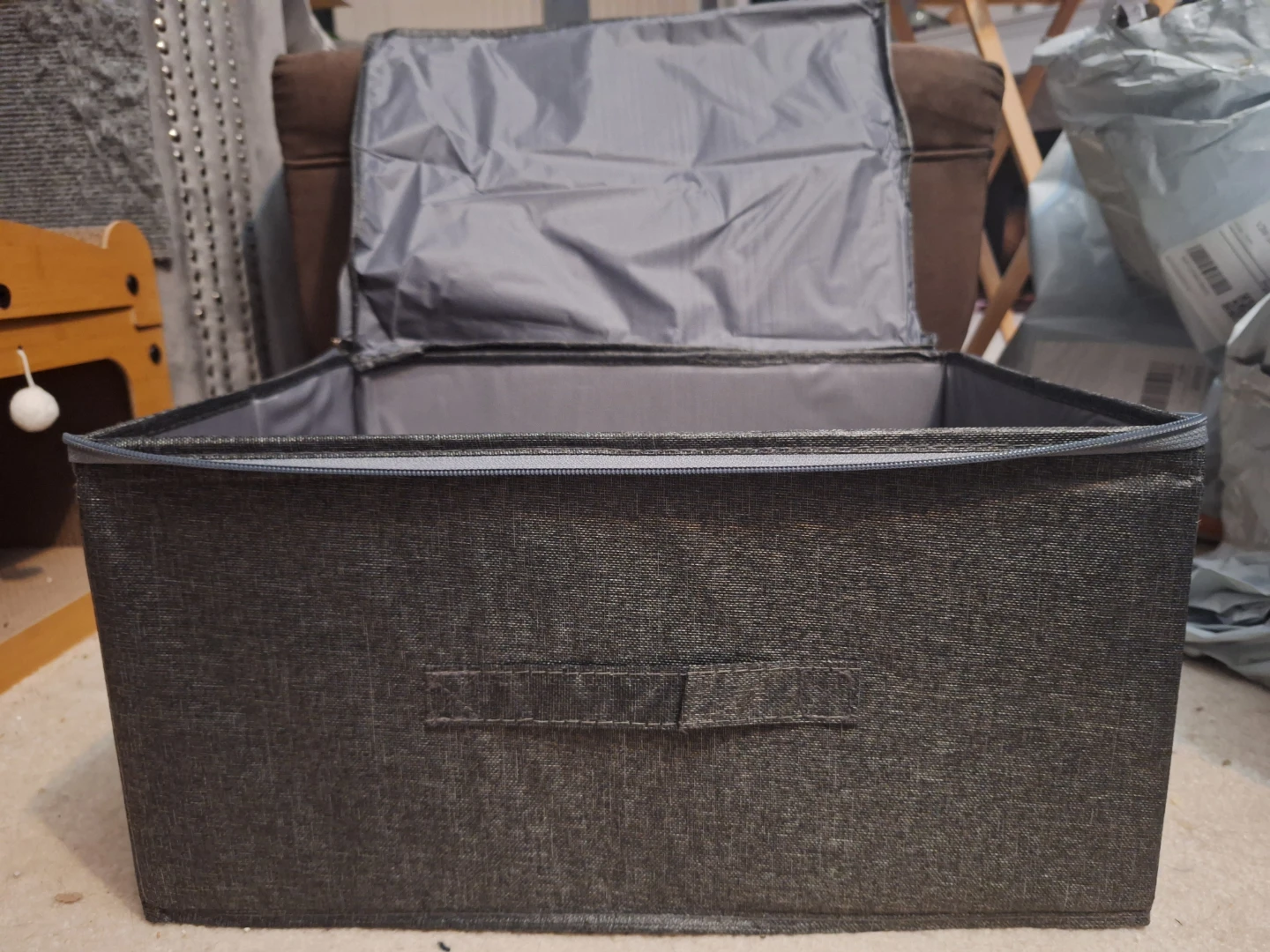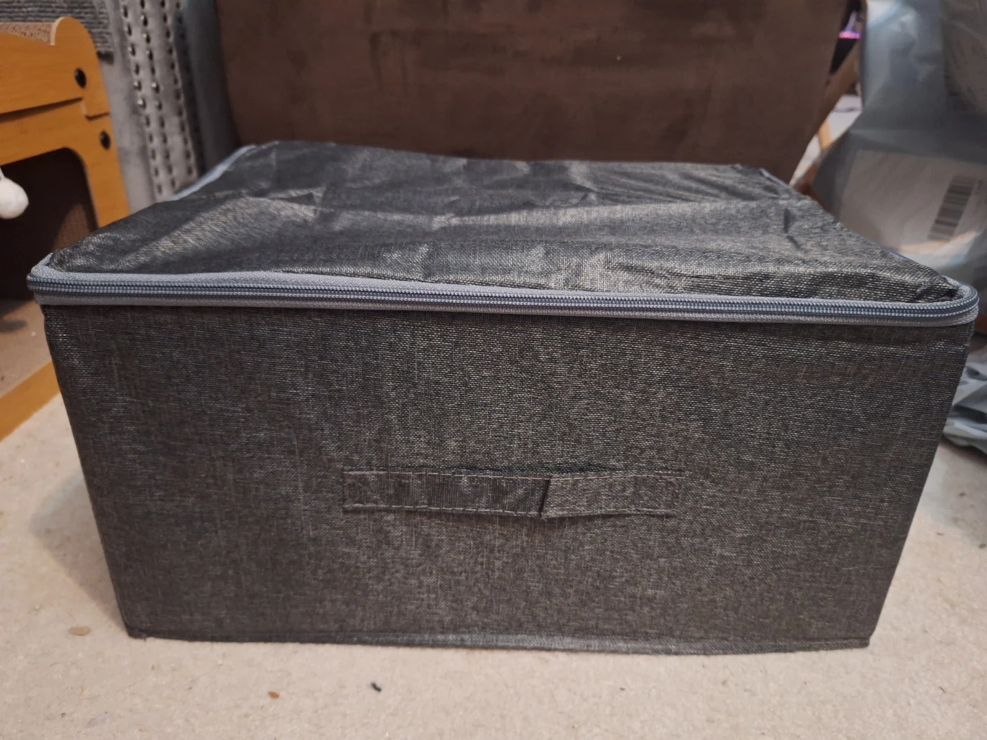Selling a handy grey fabric storage box! It comes with a lid to keep your items dust-free and organized. The neutral colour will fit in with any decor, and the fabric material is durable and easy to clean. Perfect for decluttering any space in your home