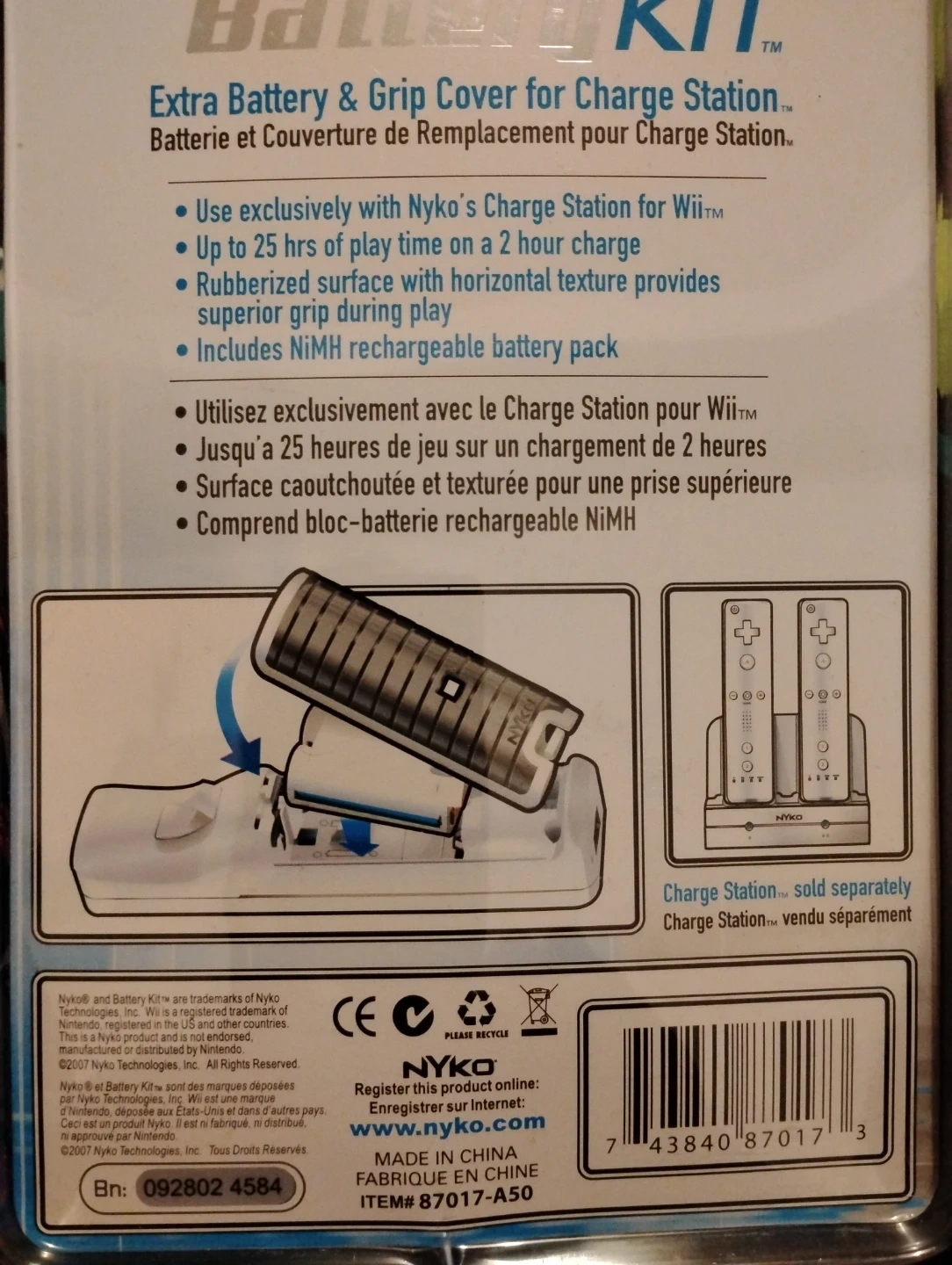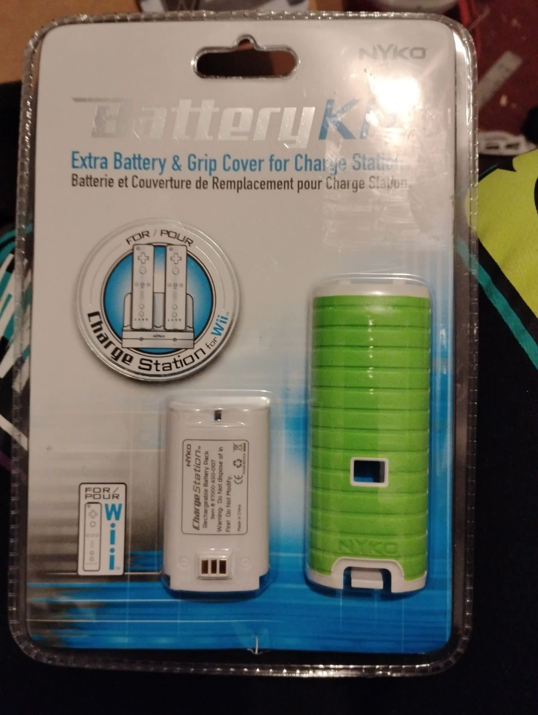 Selling a brand new Nyko Battery Kit for Wii Charge Station! This kit includes an extra battery and grip cover for your charge station. It's compatible with Nyko's Charge Station for Wii and provides up to 25 hours of play time on a 2-hour charge. The grip cover has a rubberized surface with a horizontal texture for a superior grip during play. Includes NiMH rechargeable battery pack!