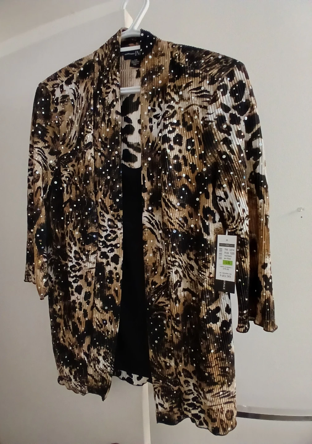 I'm selling a really cute two-in-one top. It features a fun leopard print with little sparkles. The size is L and it's brand new condition! Great as a Christmas gift option.