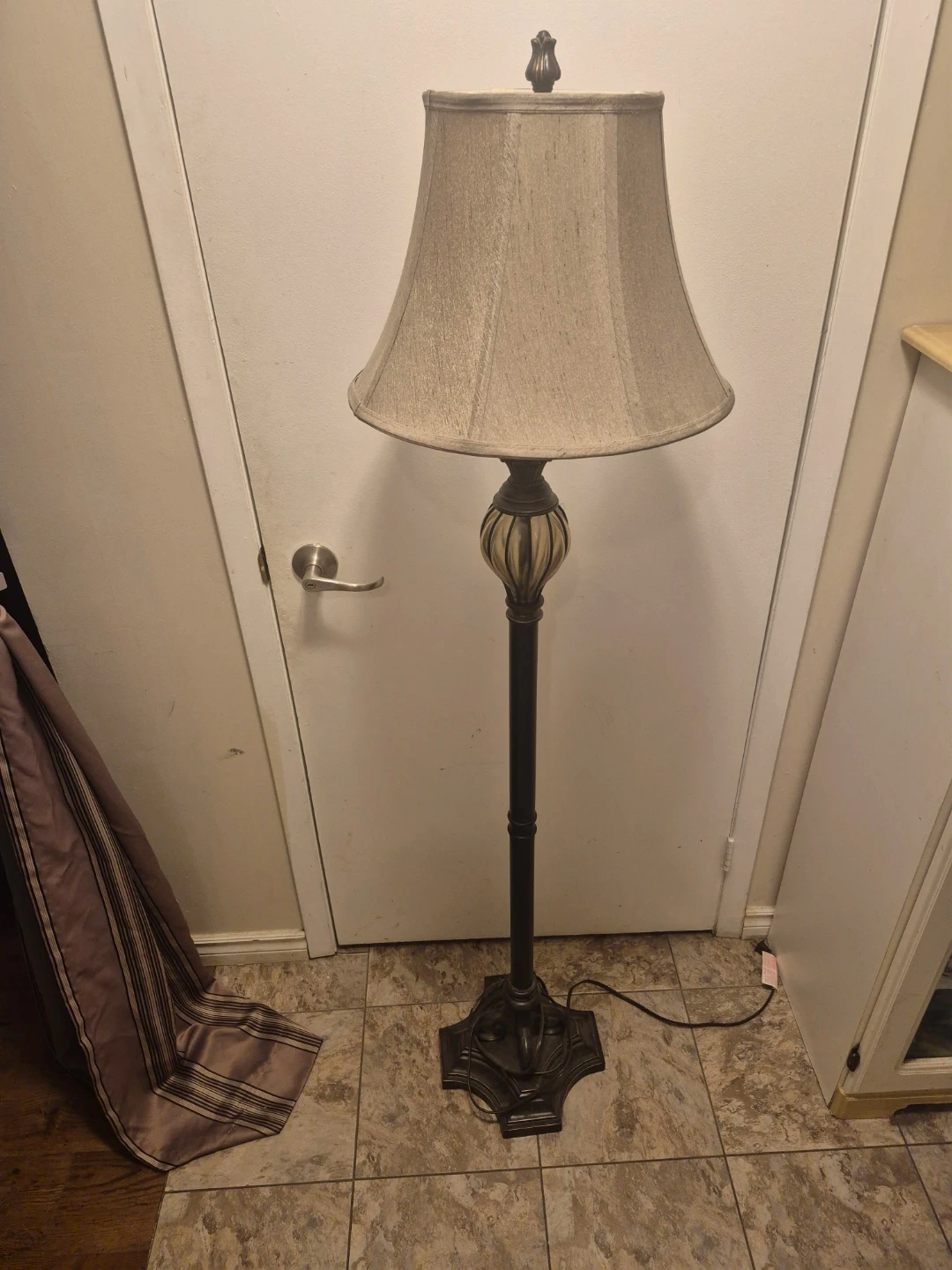 Selling a floor lamp with a beige shade. It has a decorative base and a sleek, dark stem. Great for adding some extra light to any room!