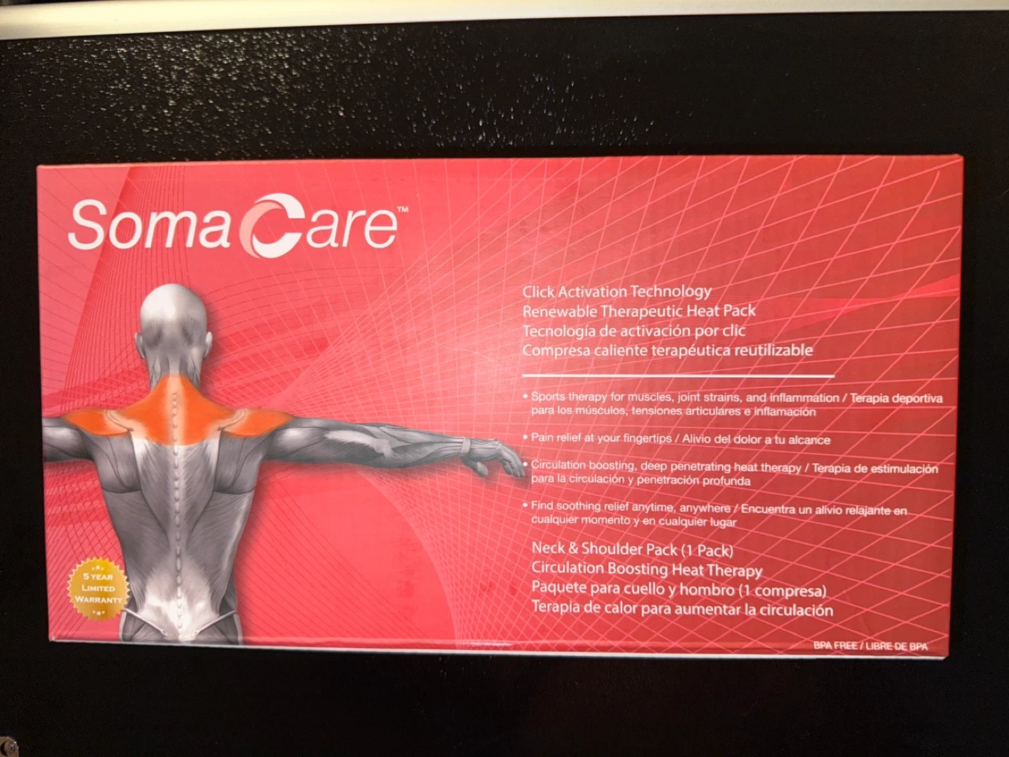 Selling a Soma Care Circulation Boosting Heat Therapy pack for the neck and shoulder. It's designed to provide circulation relief and deep, penetrating heat therapy for muscles, joint strains, and inflammation. Find soothing relief anytime, anywhere!