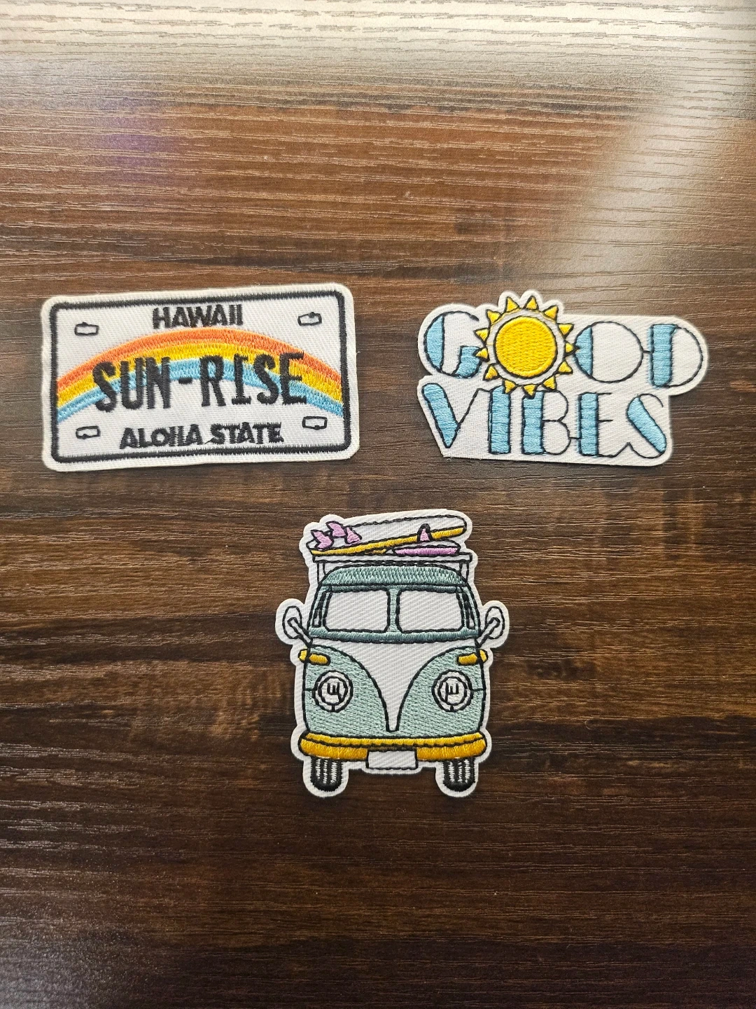 Here's a set of three iron-on patches. One is a Hawaii license plate, another says "Good Vibes," and the third is a VW van with surfboards on top. Great for adding a bit of flair to your clothes or bags!