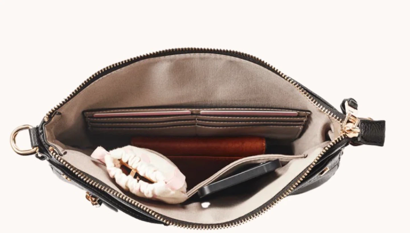 Selling a stylish black crossbody bag from Poppy & Peonies! It's Brand and comes with its original pink dust bag. The bag features gold-tone hardware and multiple zippered compartments for easy organization. Perfect for everyday use!