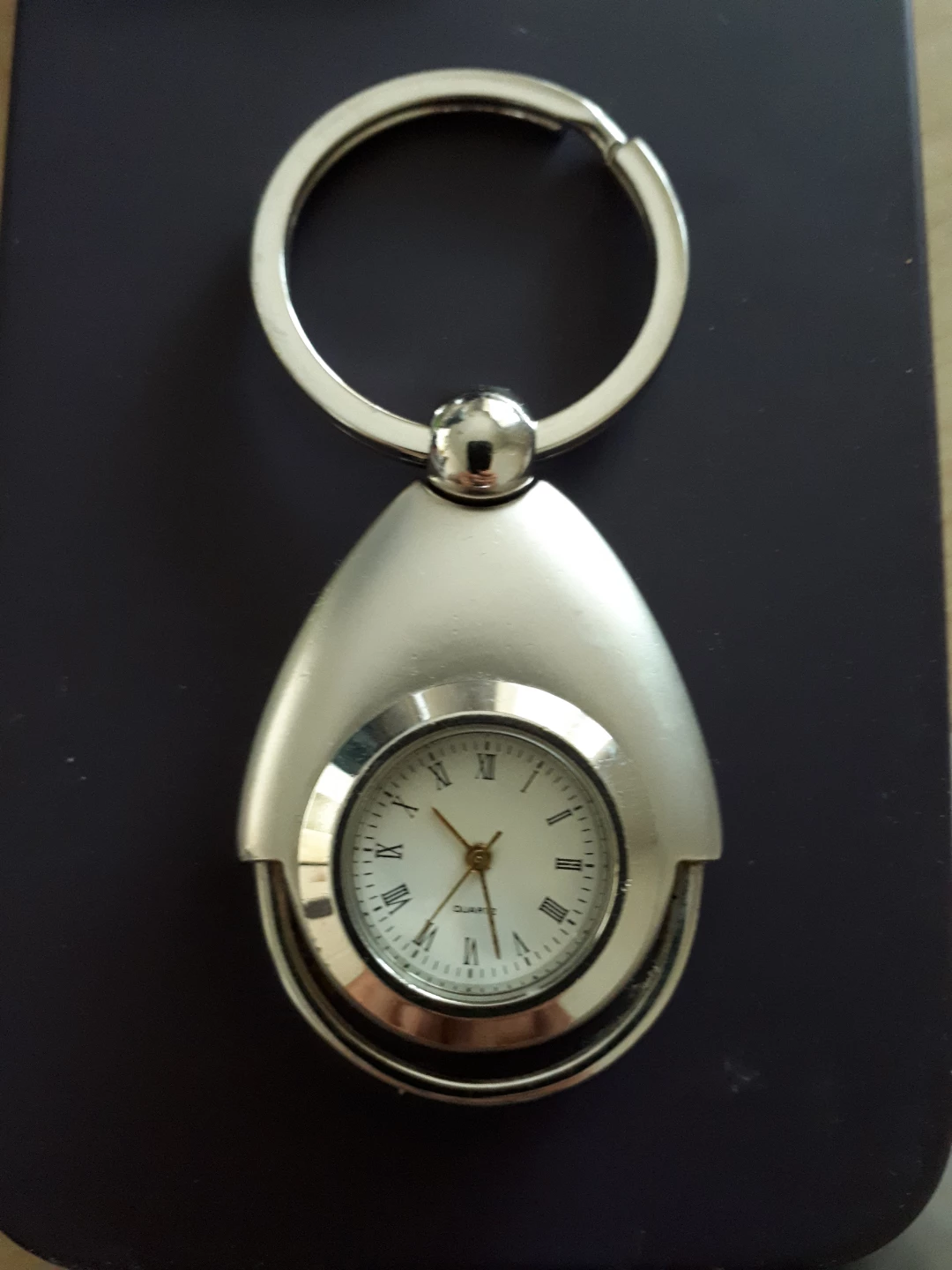 Selling a silver-tone keychain watch. It's in great condition and would be a nice accessory to add to your keys or bag