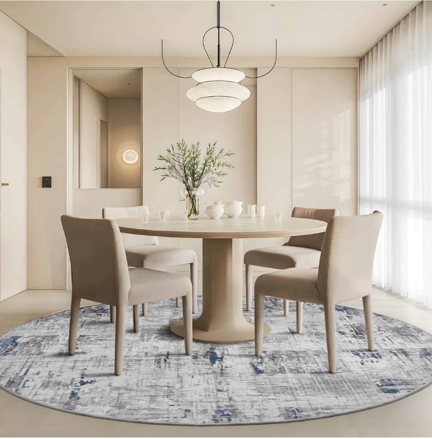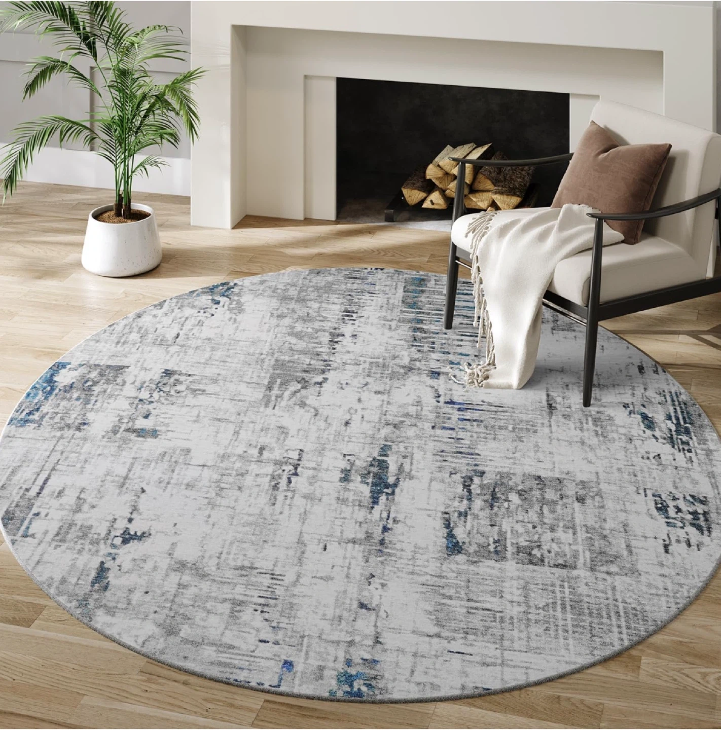 Selling a round area rug that's in great condition! It's 8 feet in diameter and features a stylish abstract design in nature white with hints of blue and grey. Perfect for adding a modern touch to your living room or dining area..