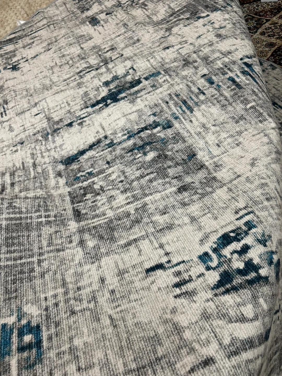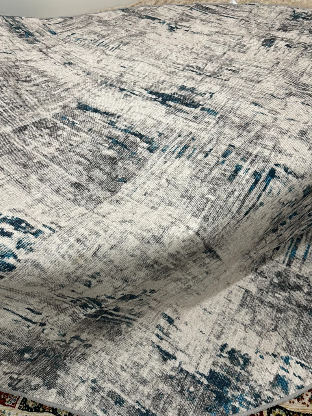 Selling a round area rug that's in great condition! It's 8 feet in diameter and features a stylish abstract design in nature white with hints of blue and grey. Perfect for adding a modern touch to your living room or dining area..