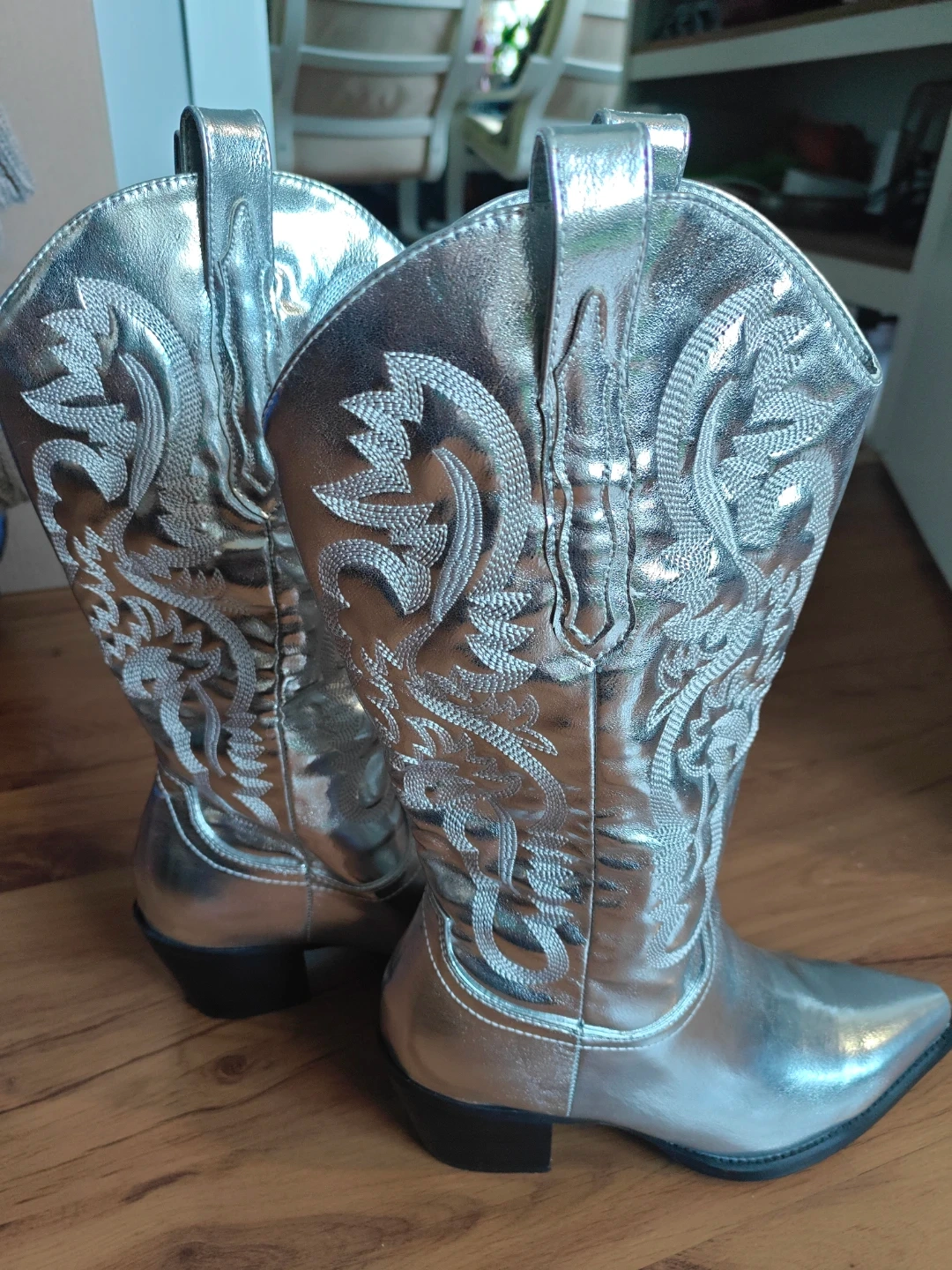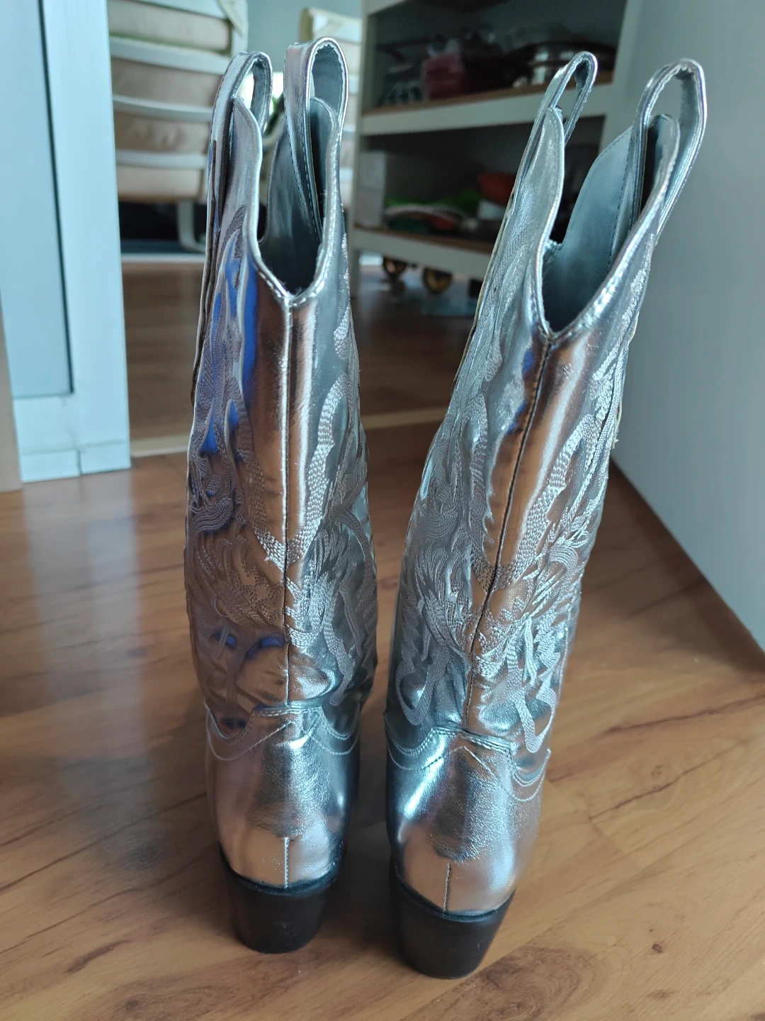 These silver cowboy boots are sure to make a statement! They're in great condition, no scratches, no stains and ready for some fun. The boots have a decorative stitched design. They are a shiny silver colour.