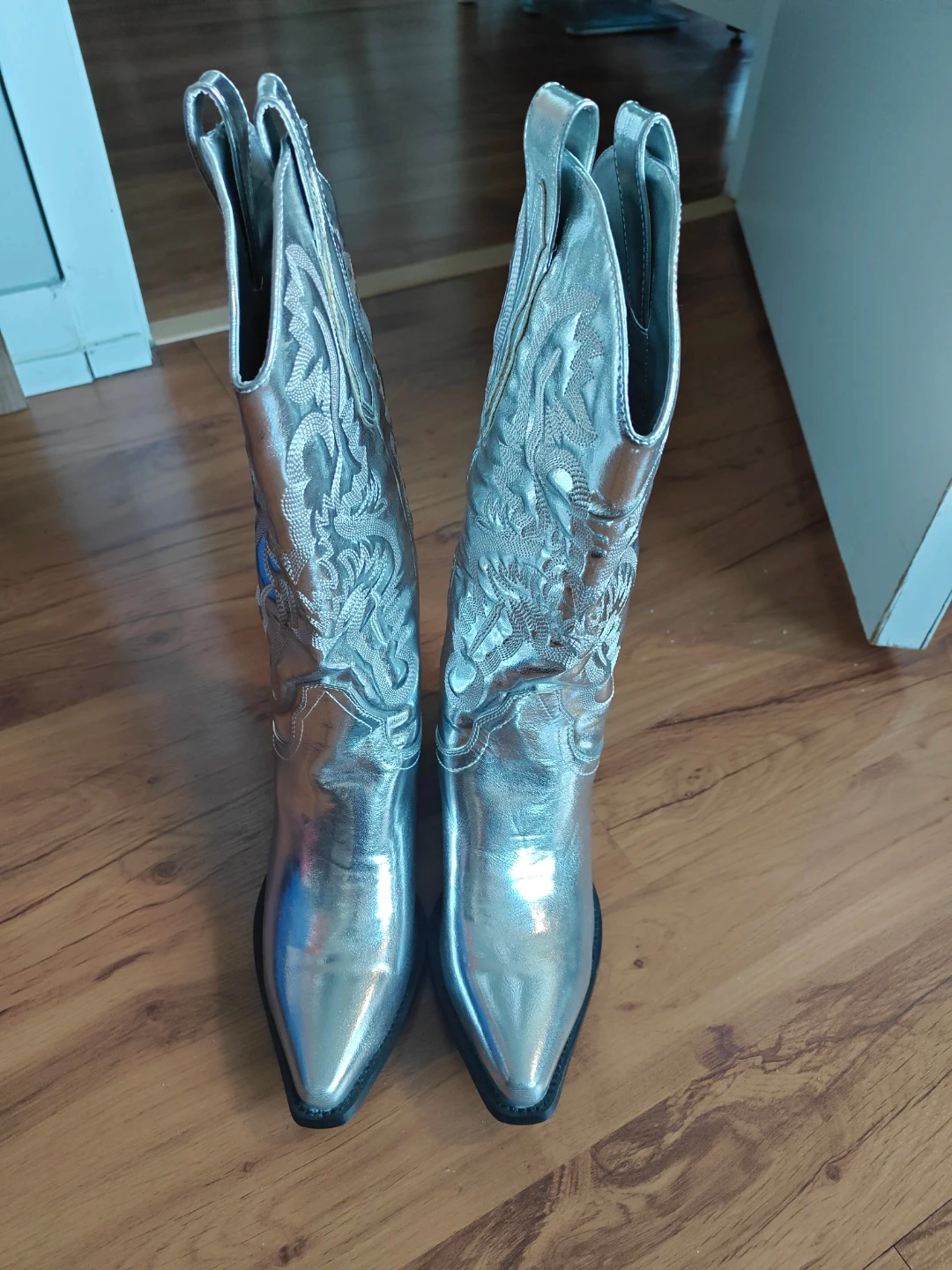 These silver cowboy boots are sure to make a statement! They're in great condition, no scratches, no stains and ready for some fun. The boots have a decorative stitched design. They are a shiny silver colour.