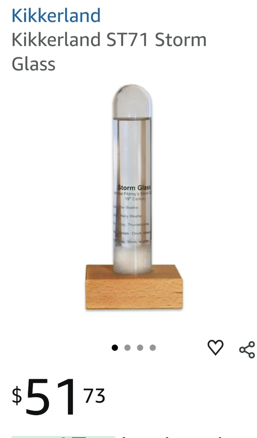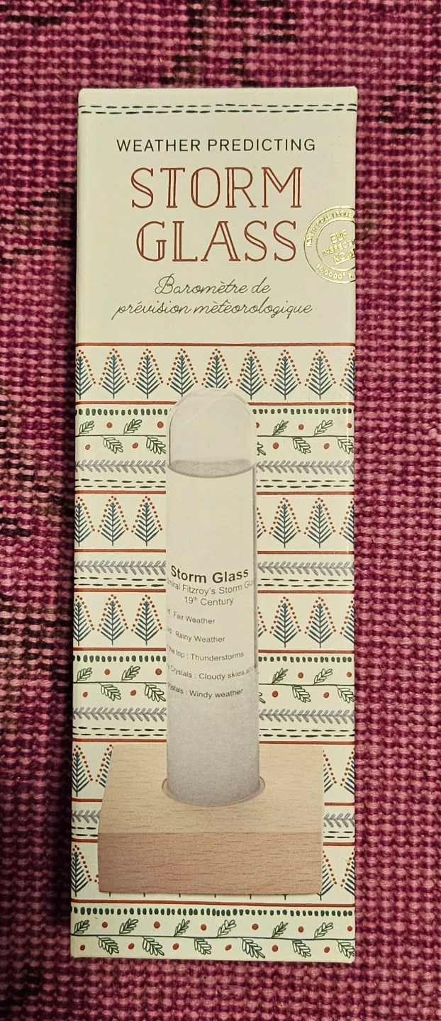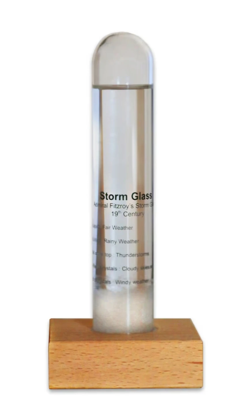 Weather Predicting Storm Glass! 17th century technology used by Charles Darwin and popularized by Admiral Fitzroy in the 19th century. It predicts fair weather, rainy weather, thunderstorms, cloudy skies, and windy weather. Sells on Amazon for $51.73