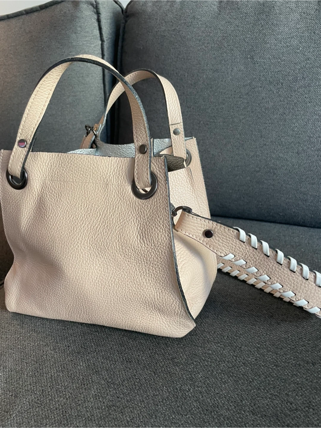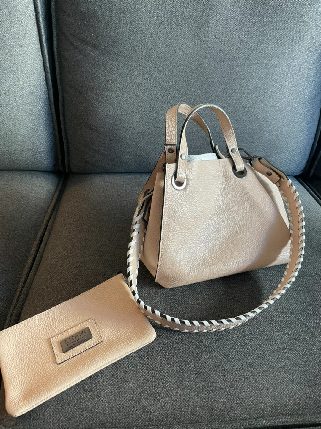 Selling a lovely Ripani handbag made in Italy! It's a beautiful beige colour and made of leather. It comes with a matching pouch. Perfect for everyday use or a special occasion.