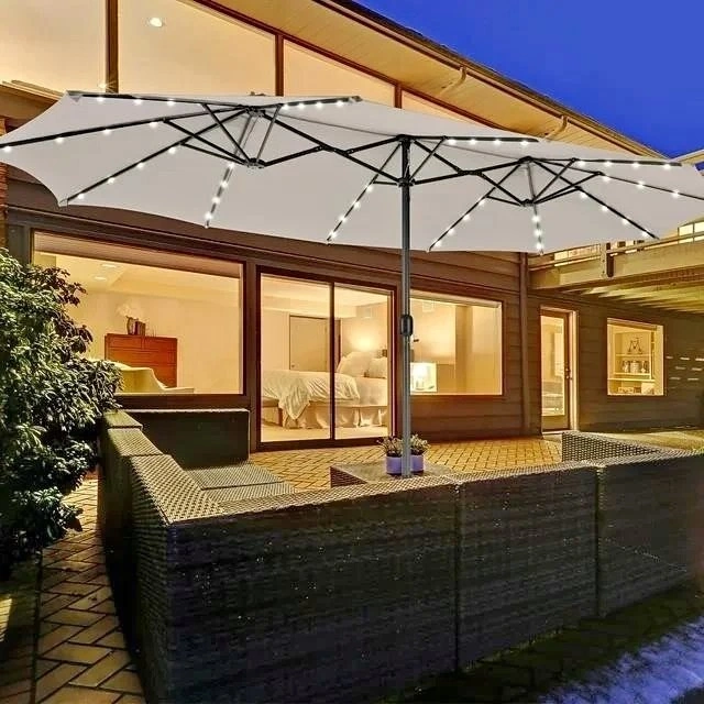 This double-sided patio umbrella provides you with spacious shady space for you to enjoy beautiful natural scenes. 15.4' x 9.2' large canopy provides roomy coverage for a full set of outdoor furniture, and you can spend leisure time with family and friends. The 12-rib steel structure is covered by tough polyester fabric ensures lasting durability for outdoor use. Each rib has 4 solar LED lights, and there are 48 LED lights help to enhance romantic feel at night. All lights are powered by the top solar panel, effectively saving power. There is a standby battery that is prepared for lack of power. It is ultra-easy to open and close the umbrella by rotating the hand-crank mechanism. When the umbrella is not in use, you can close it with a long fixation strap for better storage. More than placing in garden, patio and backyard, our twin outdoor umbrella is also ideal for commercial places, such as market, cafe, bar.