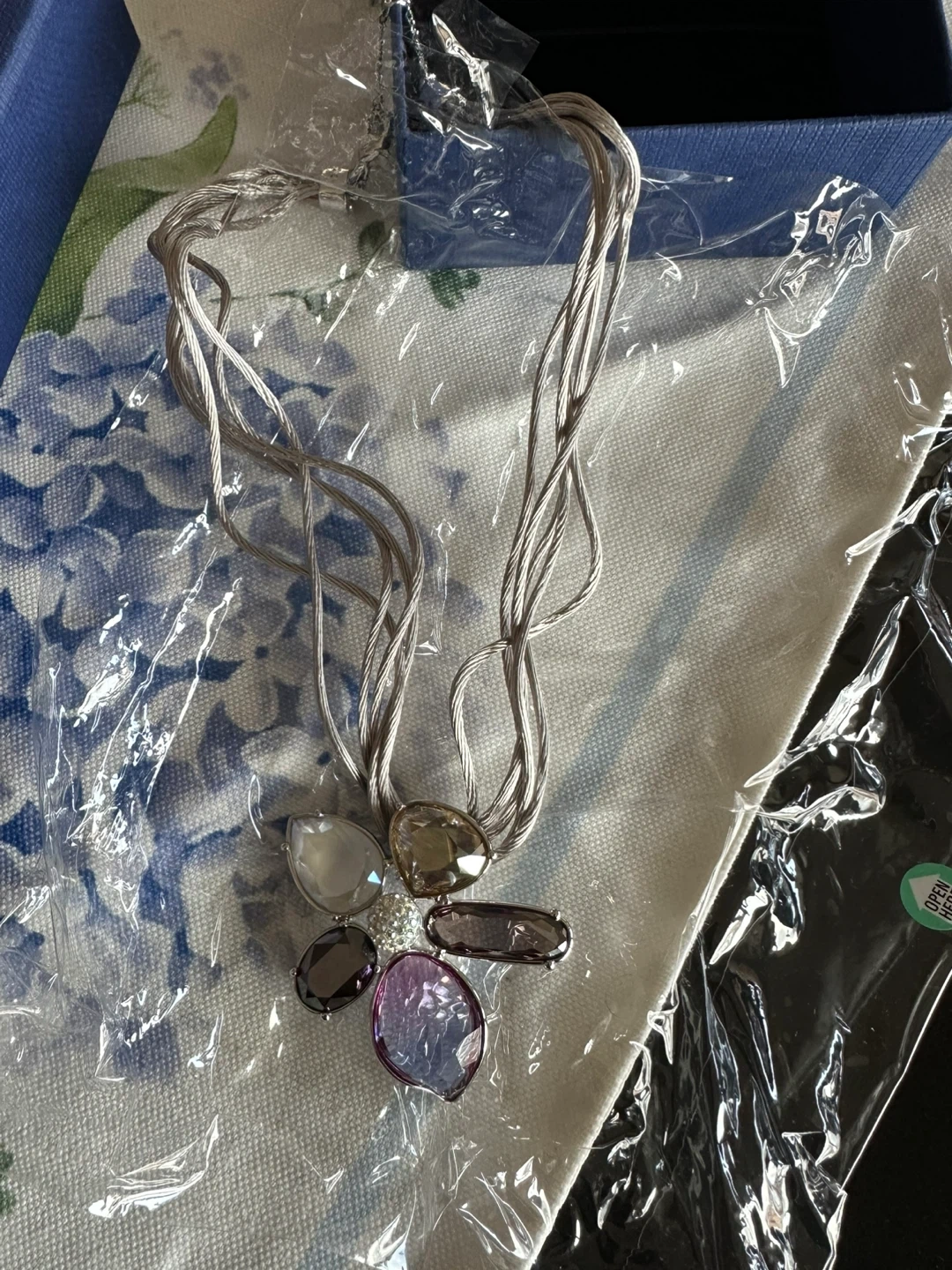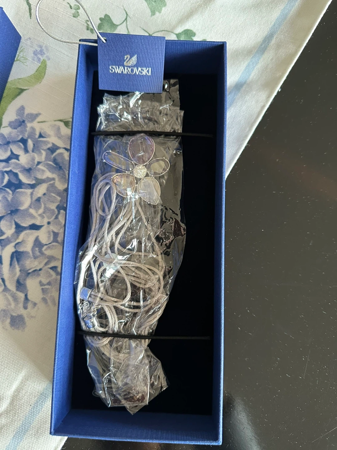 This is a brand new Swarovski flower necklace, still in its original packaging! It comes with the box, making it perfect for a gift. The necklace features a beautiful floral design with multiple crystals.