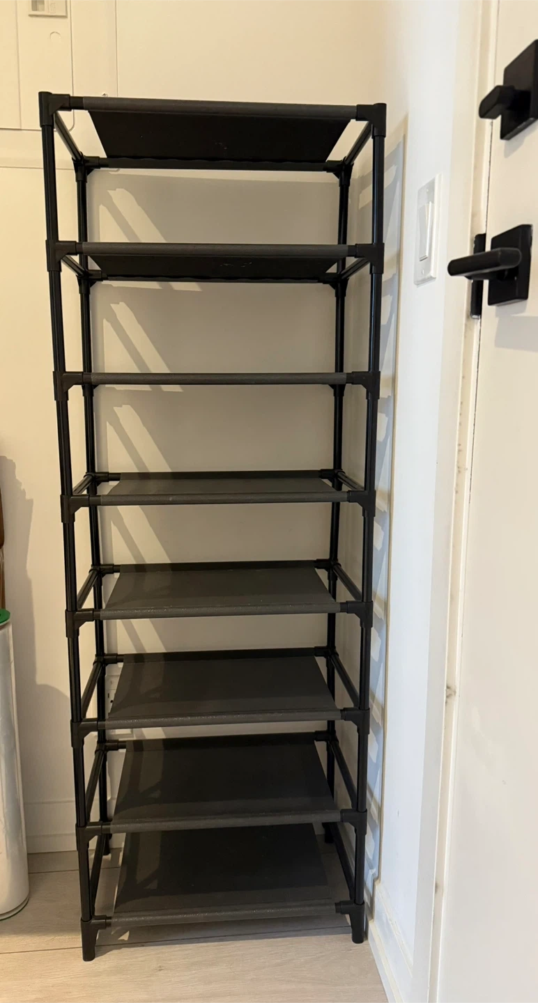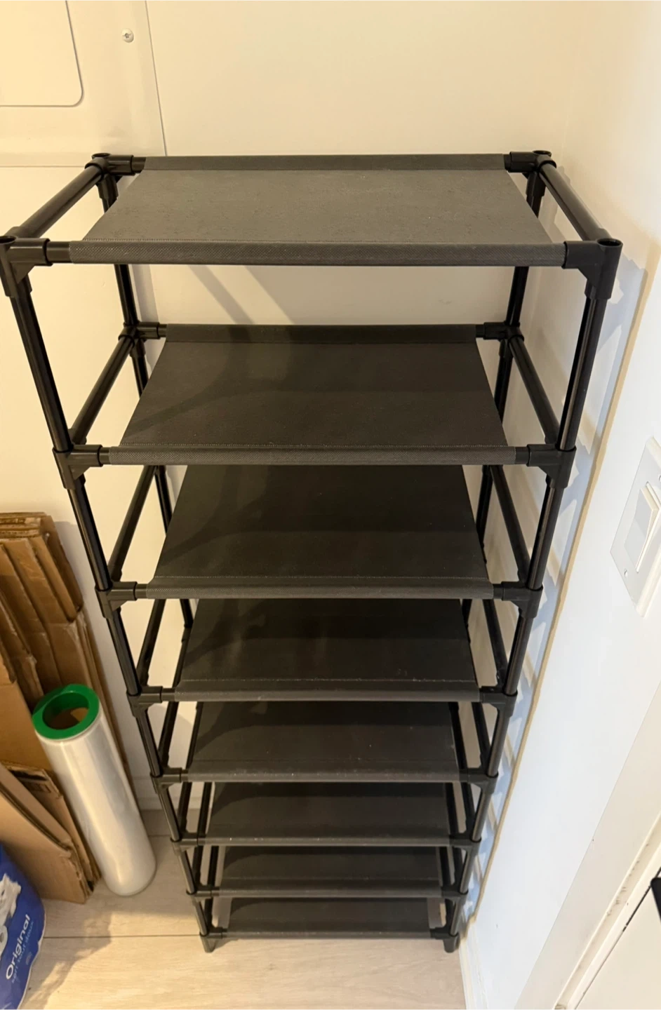 Just needs a little wipe down, but in perfect working condition. Fits two pairs per level. Adjustable, you can vary the height by removing levels. Bought for 40CAD+