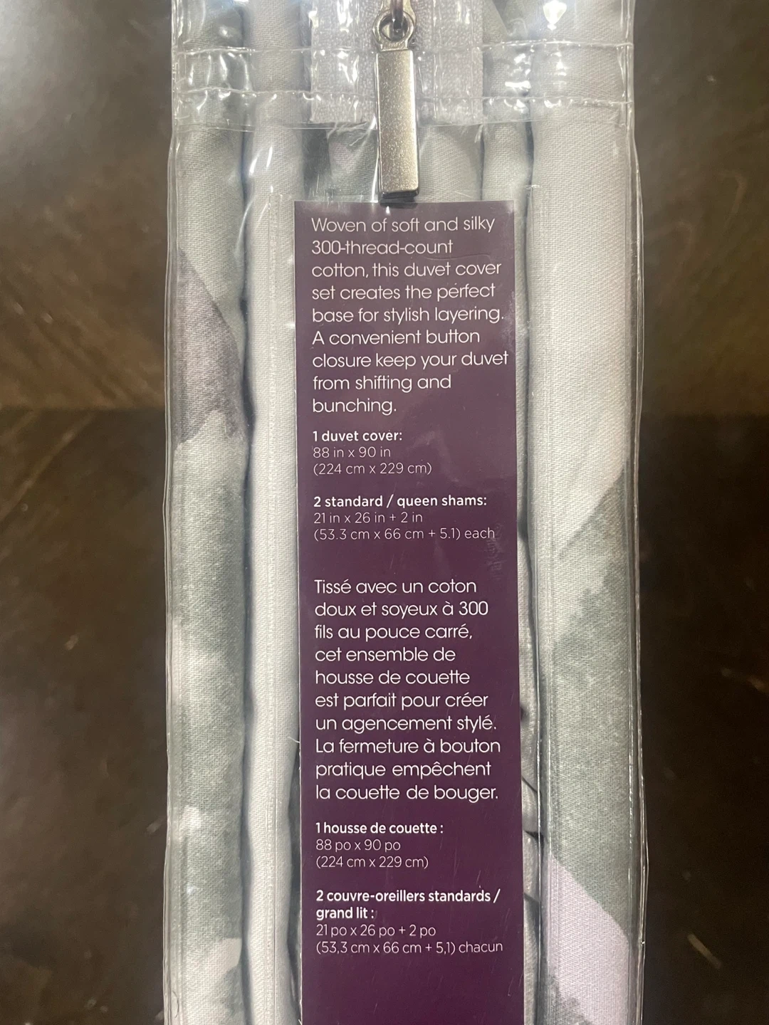 Selling a new Life At Home duvet cover set for a full/queen size bed. It's made of 100% cotton with a 300 thread count. The set includes one duvet cover (88 in x 90 in) and two standard/queen shams (21 in x 26 in + 2 in). It's quick drying and has a convenient button closure to keep your duvet from shifting!