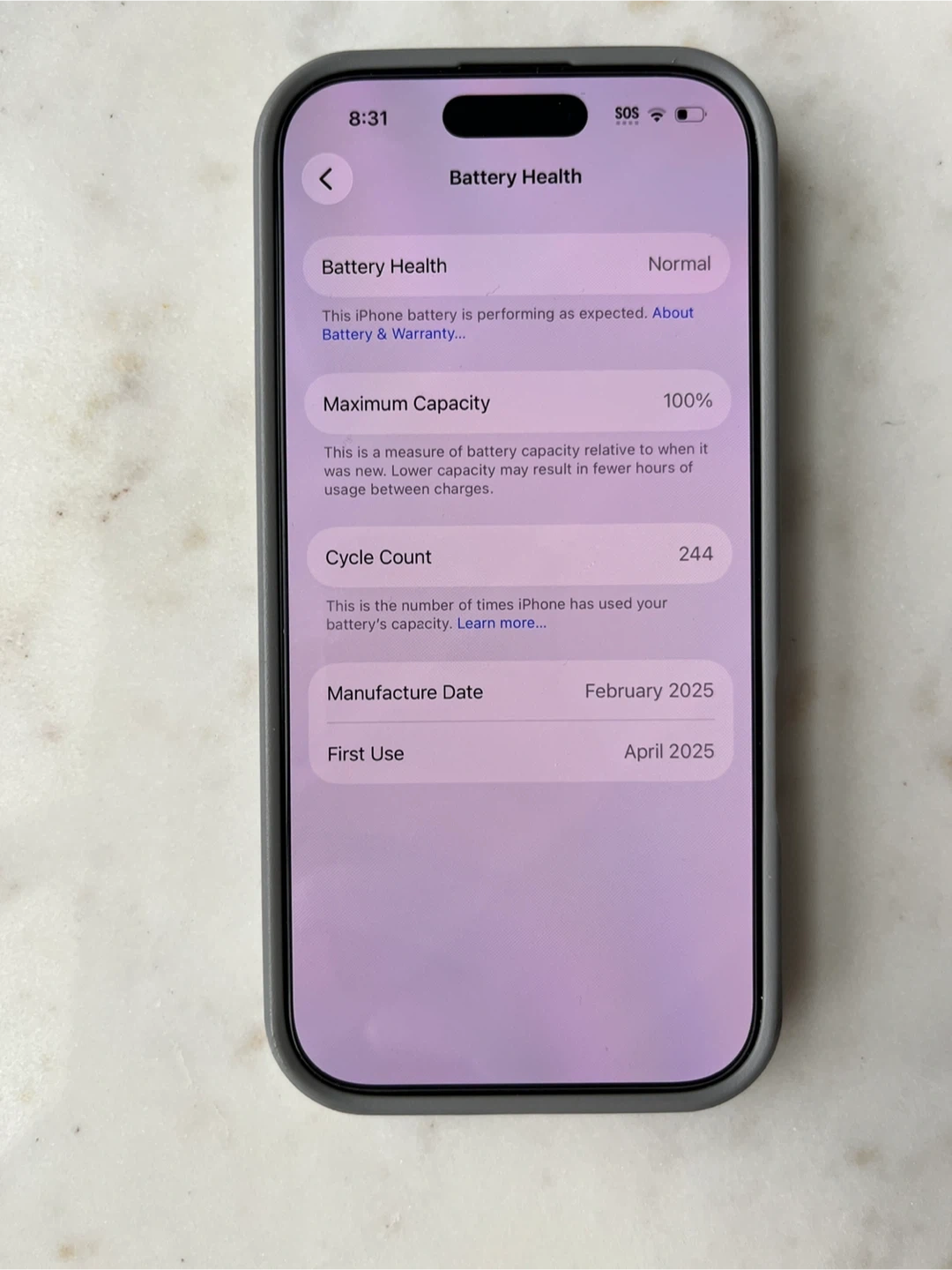 100% battery health, cycle 244, used for less than an year. Warranty till 2026-04-08. Bought new directly from Apple, no carrier lock.
