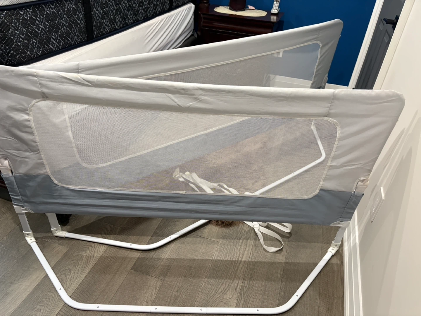 Selling a foldable bed rail in great condition! It's perfect for keeping your little one safe and secure while they sleep. Easy to install and folds down for convenient storage when not in use. It's a must-have for parents transitioning their child to a bigger bed. Size is 80 inches by 60inches. It is for a queen size bed