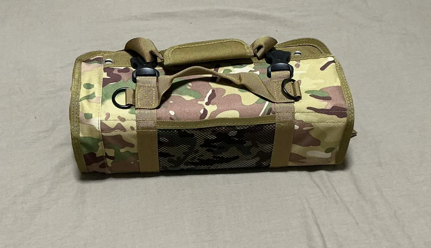 Tool Roll Up Bag in a camouflage pattern! It features transparent pockets with zippers to organize your tools and supplies. There are also storage panels with elastic bands, perfect for holding items like hammers and axes. The magnetic fastening strip helps keep metal screws, bolts, nuts, and pins in place. The bag also has a pop-out kickstand.