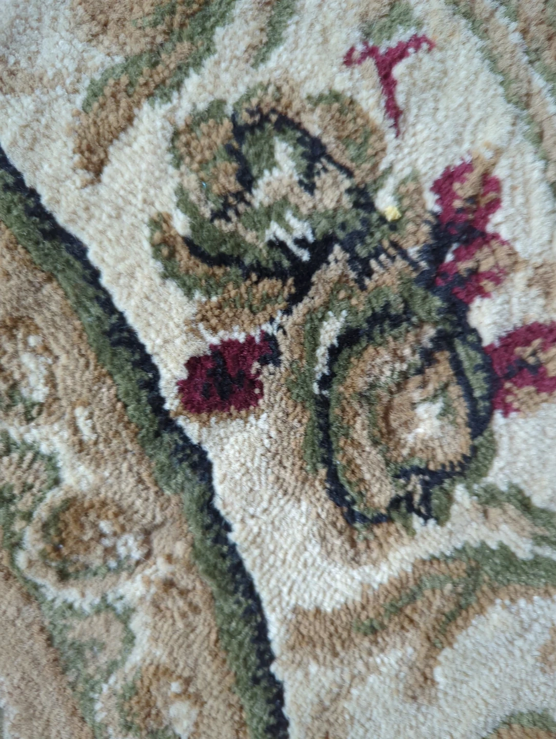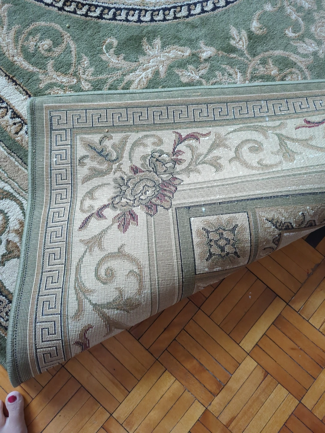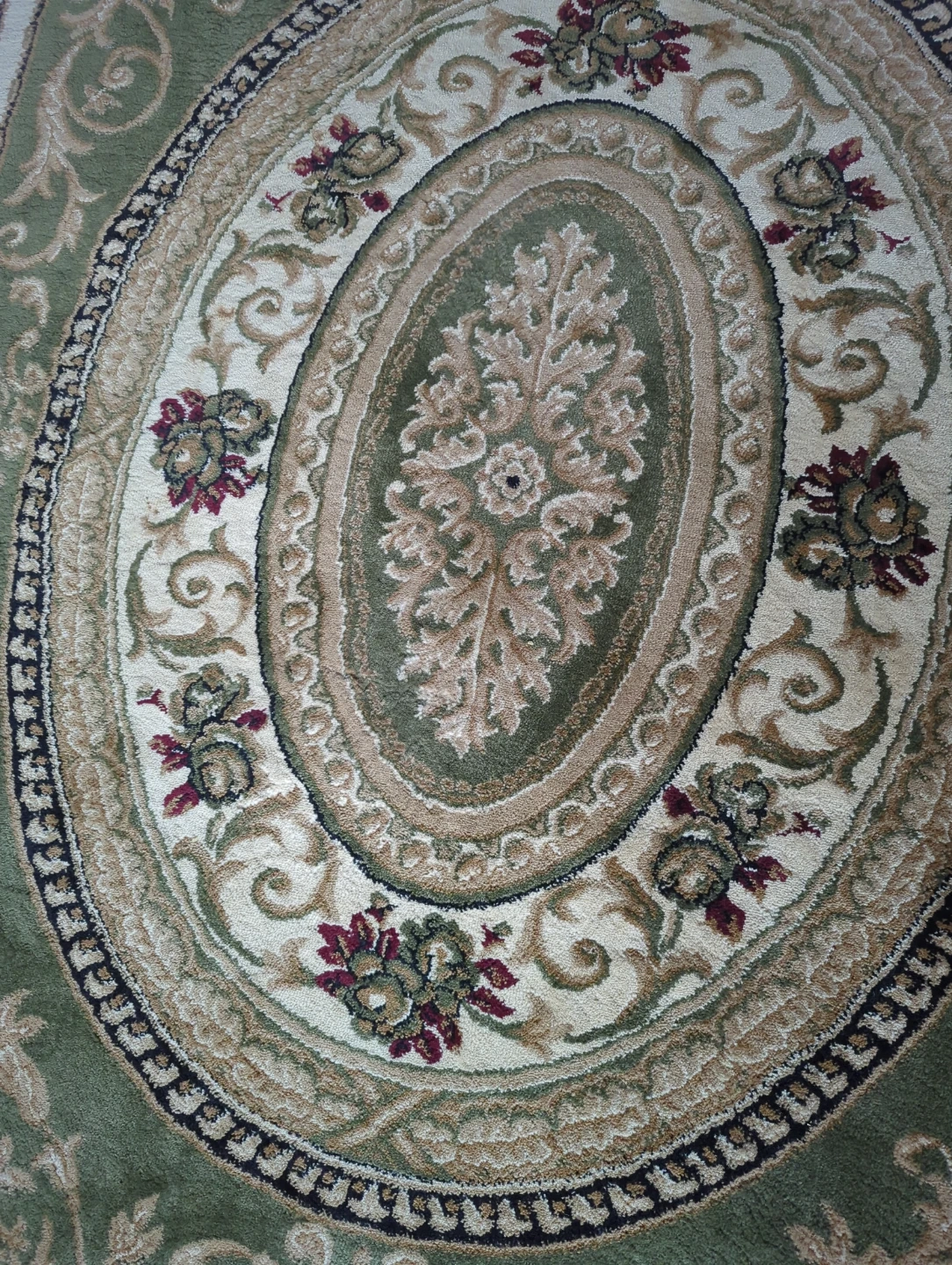 Selling a lovely area rug with a green and floral pattern. It's in good condition and would look great in any room. The rug features a detailed floral design with a green border and a central oval pattern. Perfect for adding a touch of elegance to your home!