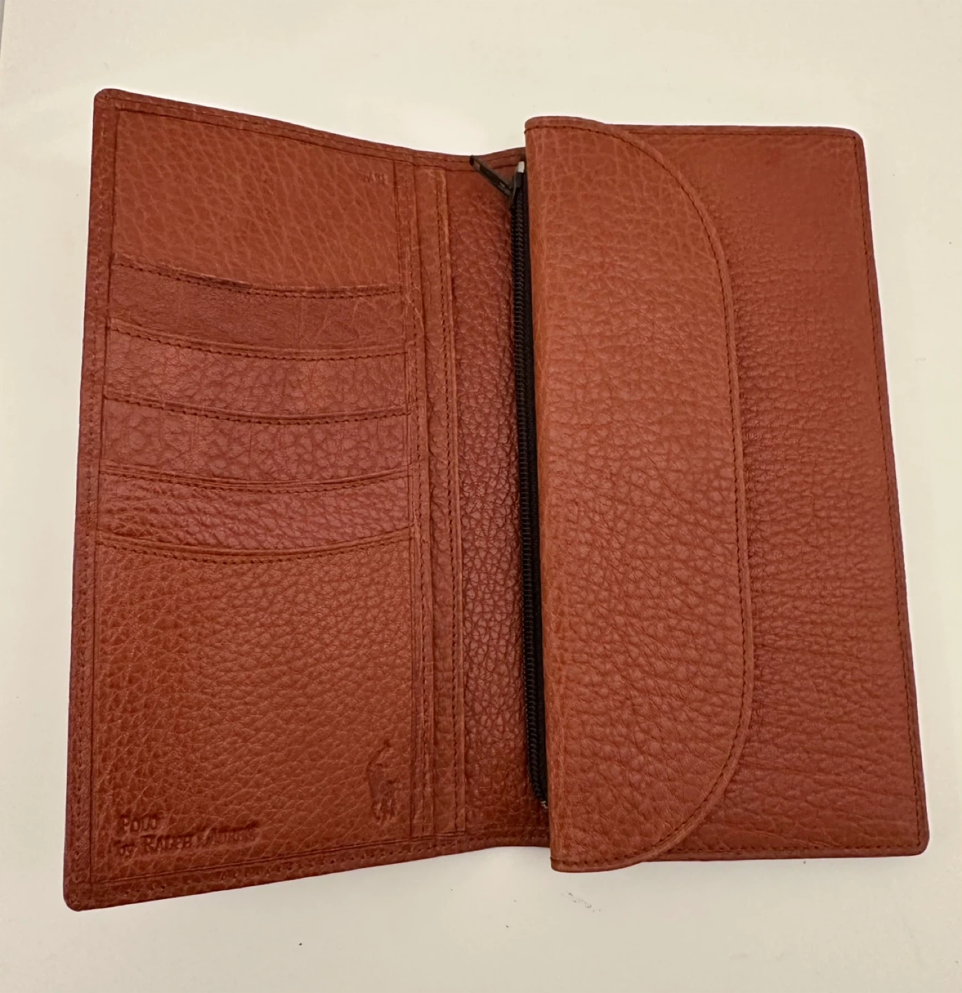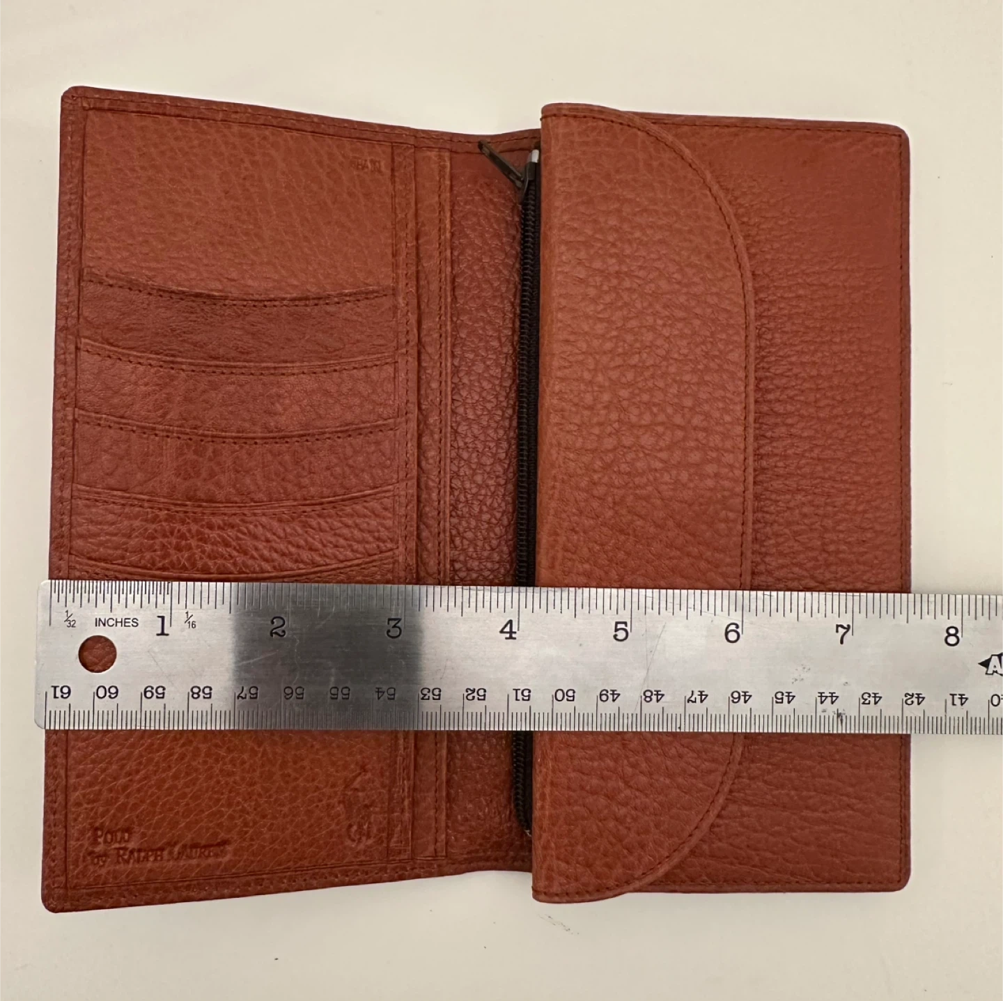 Selling a Polo by Ralph Lauren leather wallet. It's in great condition and has a classic, timeless look. The wallet measures approximately 7.5 inches in length. It's a beautiful brown color and made of high-quality leather
