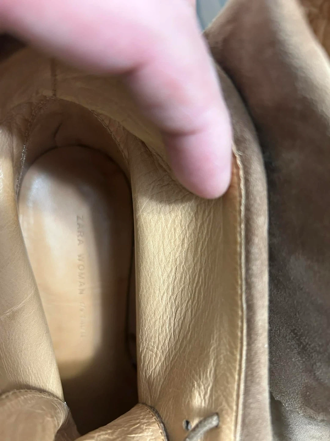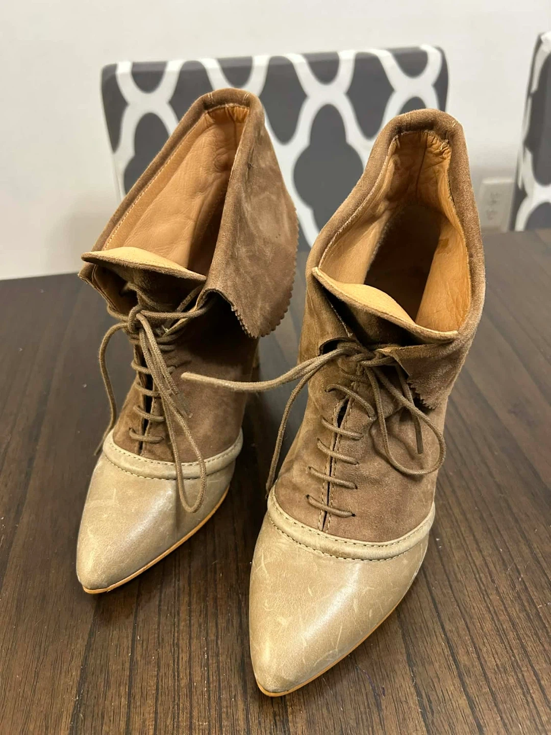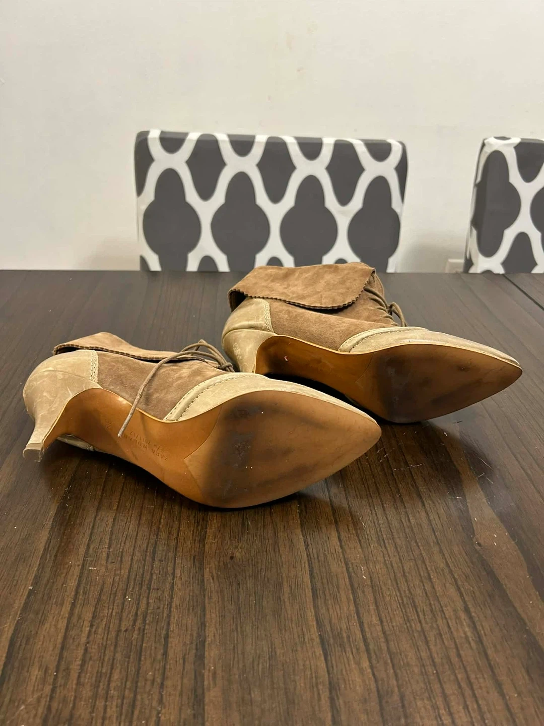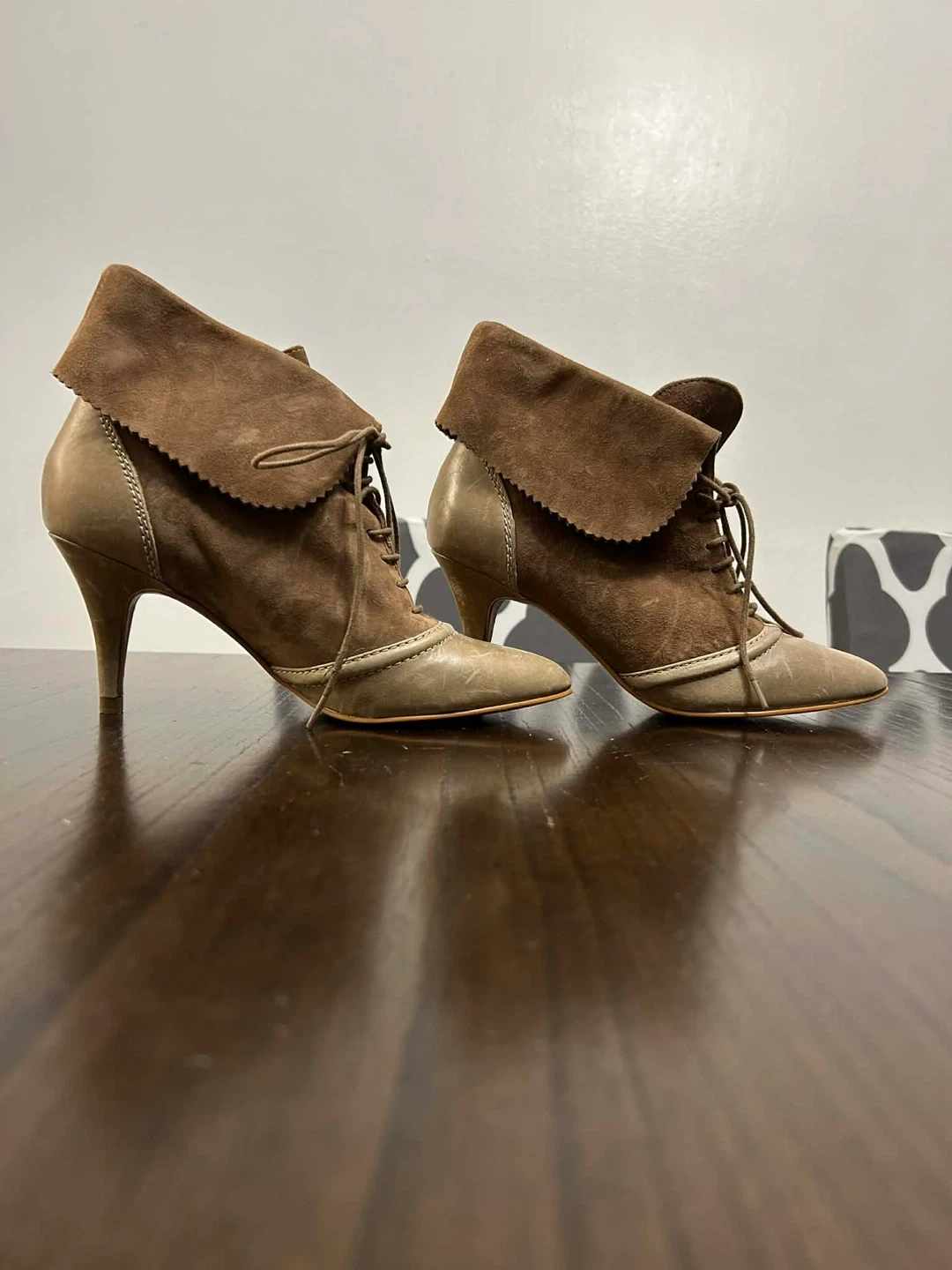 Zara Woman heeled boots, size 38. These boots are made in China from suede and leather. They have a lace-up front and a unique fold-over design