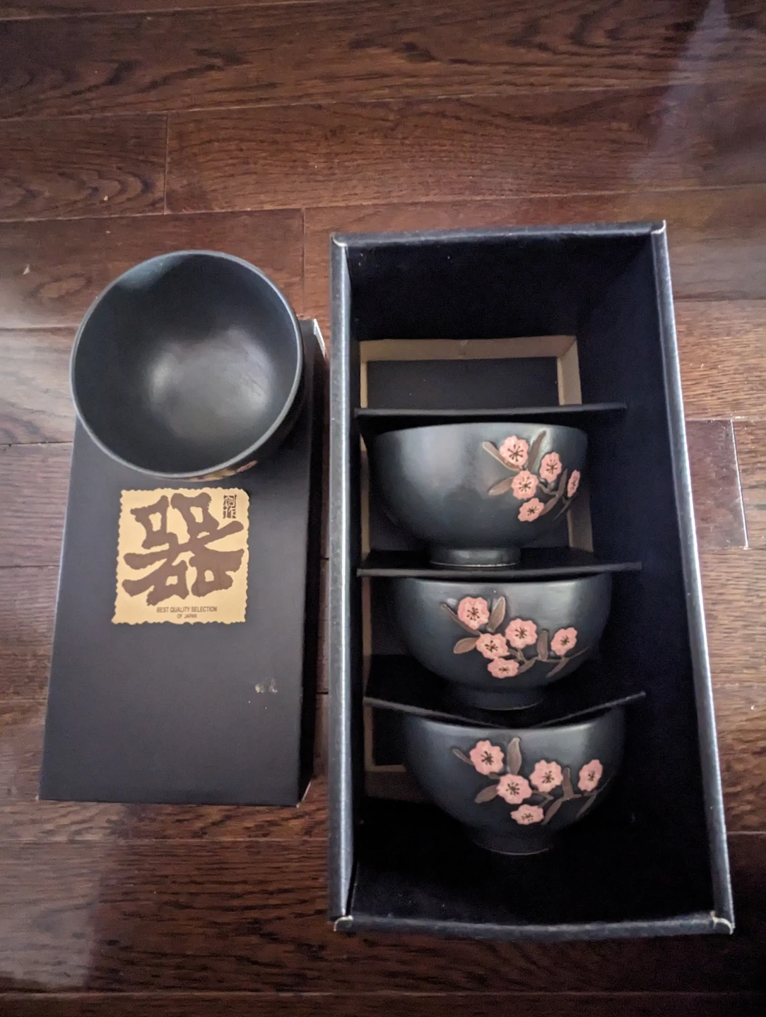 I'm selling a set of beautiful Japanese bowls. They come in their original box and feature a lovely cherry blossom design. Perfect for adding a touch of elegance to your dining table!