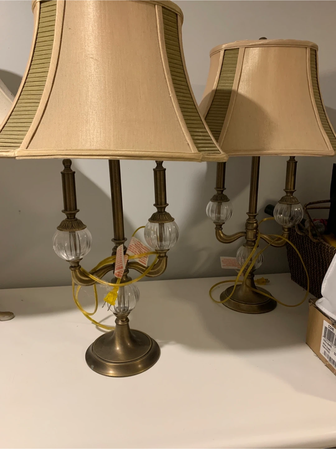 Selling a pair of vintage lamps! They feature a brass base with crystal ball accents and a neutral-toned lampshade. These lamps would add a touch of elegance to any room. Shades need a good dusting!