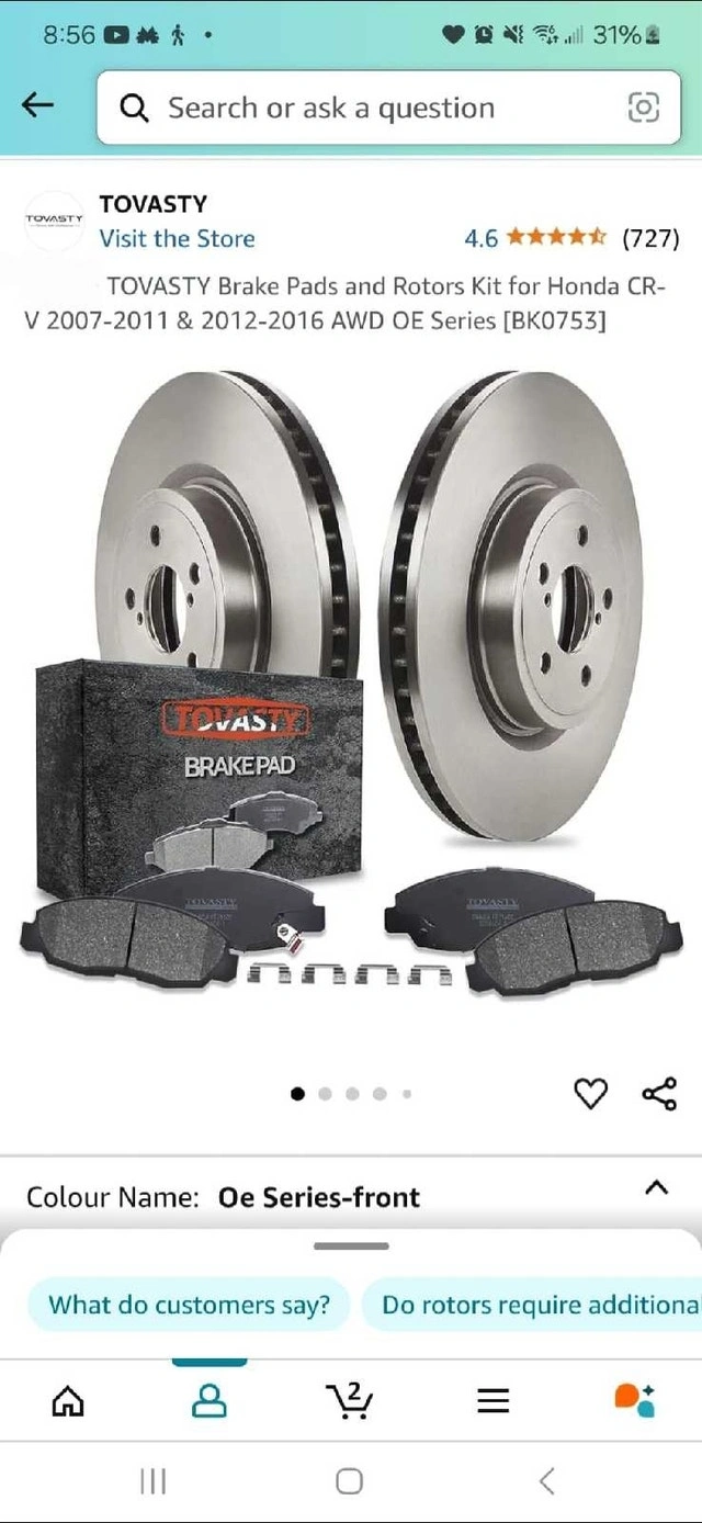 Brand New TOVASTY Rear Brake Pads and Rotors Kit for Honda CR- V 2007-2011 & 2012-2016 AWD OE Series [BK0753]