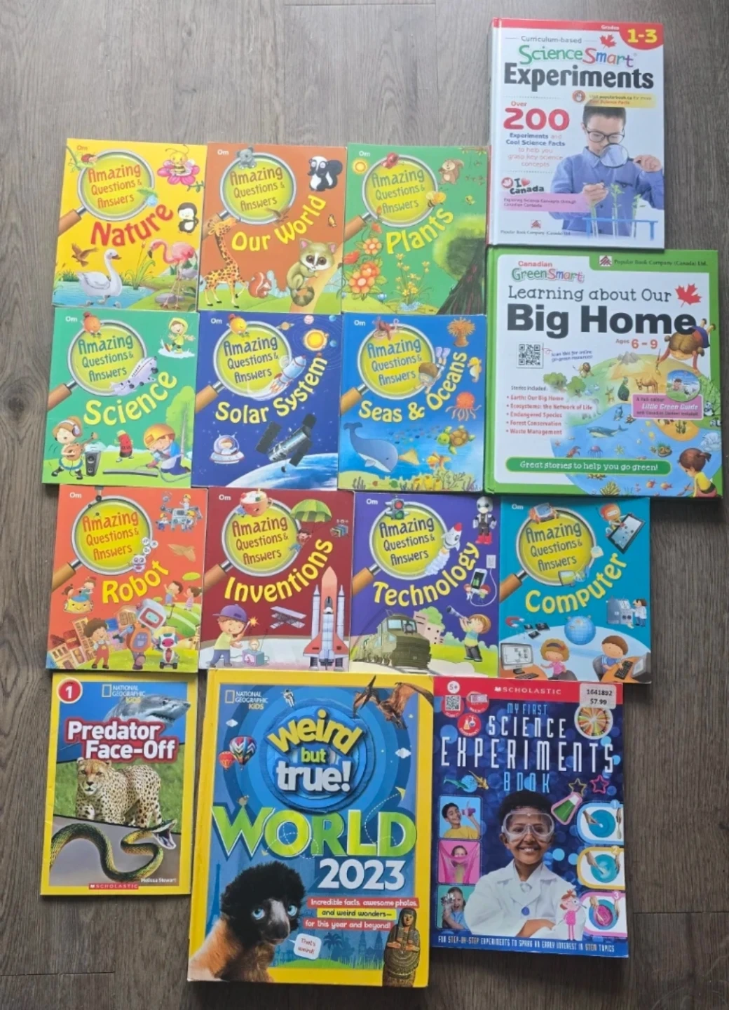 Selling a great bundle of educational books for kids! Includes the 'Amazing Questions & Answers' series covering topics like Nature, Our World, Plants, Science, Solar System, Seas & Oceans, Robots, Inventions, Technology, and Computers. Also includes 'Science Smart Experiments', 'Learning about Our Big Home', 'Predator Face-Off', 'Weird but True! World 2023', and 'My First Science Experiments Book'. Perfect for sparking curiosity and learning!