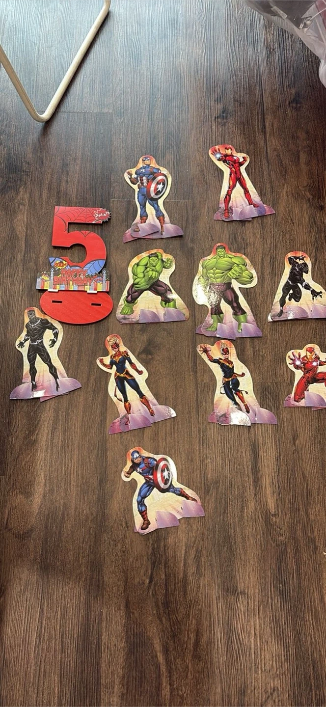 Selling Marvel Avengers themed birthday party table decorators ! Includes standees of various characters like Captain America, Hulk, Iron Man, and Black Panther.