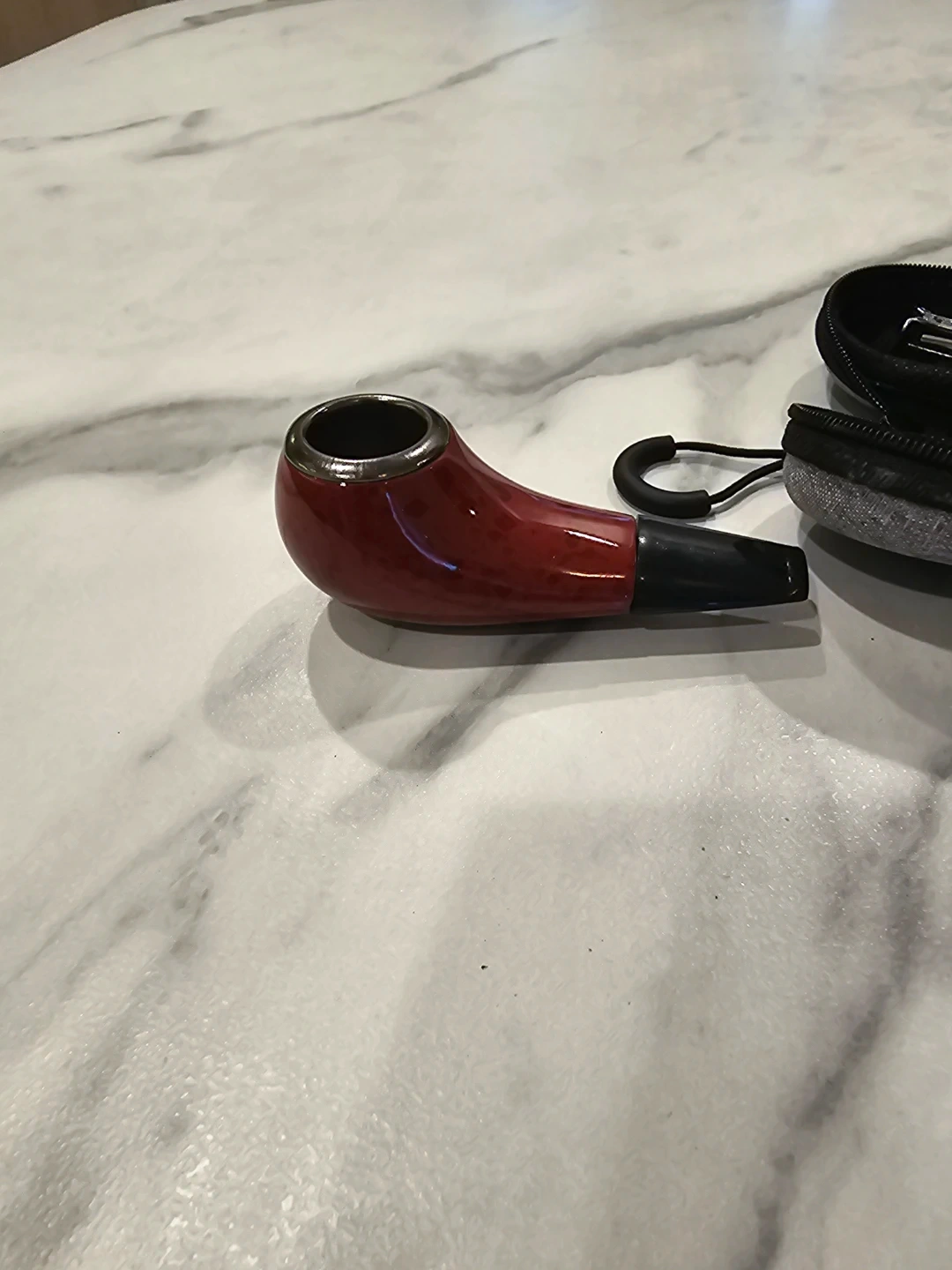 Selling a smoking pipe that comes with a carrying case and a pipe tool. The pipe is red and black, and its new condition. It's ready for a new owner! BRAND NEW Never used! Glossy Woodgrain Look.