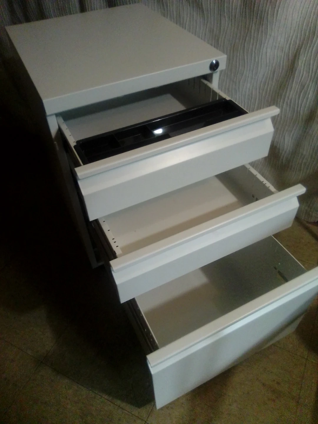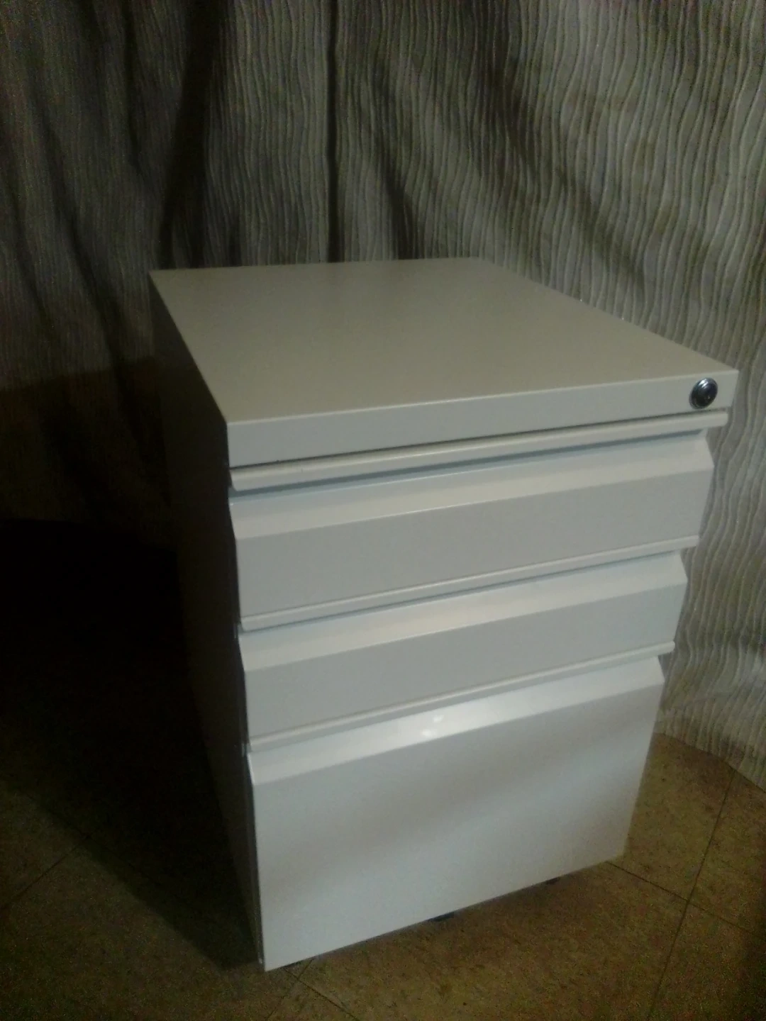 Here's a clean and simple white file cabinet with three drawers! It's perfect for organizing your documents and keeping your workspace tidy. It has a sleek design that fits well in any office or home setting. It's in great condition and ready to use!