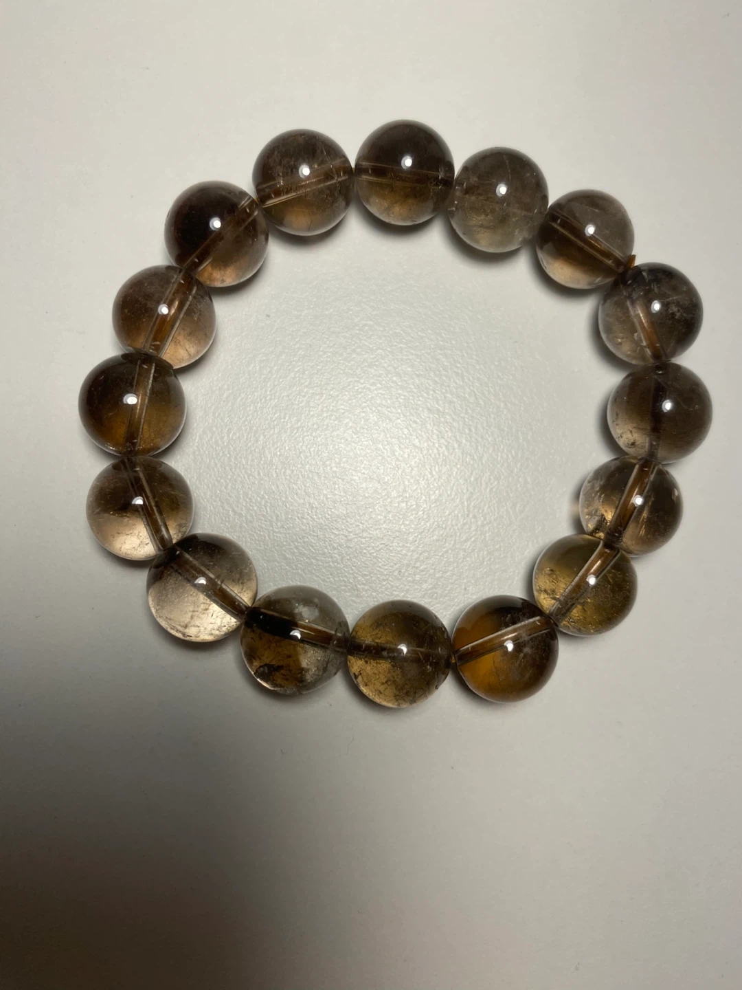 Here's a beautiful smoky quartz crystal bracelet! It's in great condition and features smooth, round beads. Perfect for adding a touch of earthy elegance to any outfit
