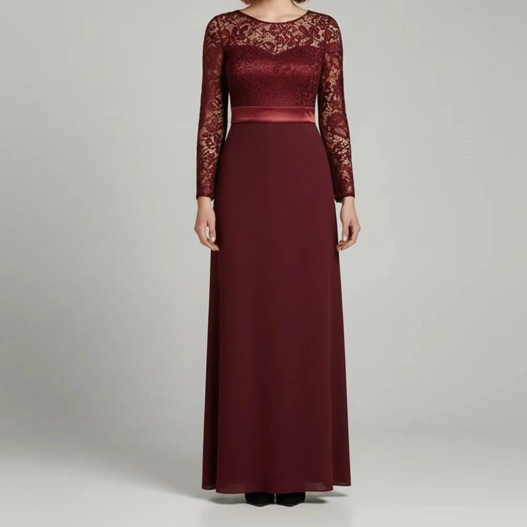 Beautiful burgundy maxi dress with long lace sleeves! It's in great condition and perfect for a special occasion. The first picture is a reference of how it might look on your body. Don't have a real tried on picture as it didn't fit me after buying so never really got to wear it lol.