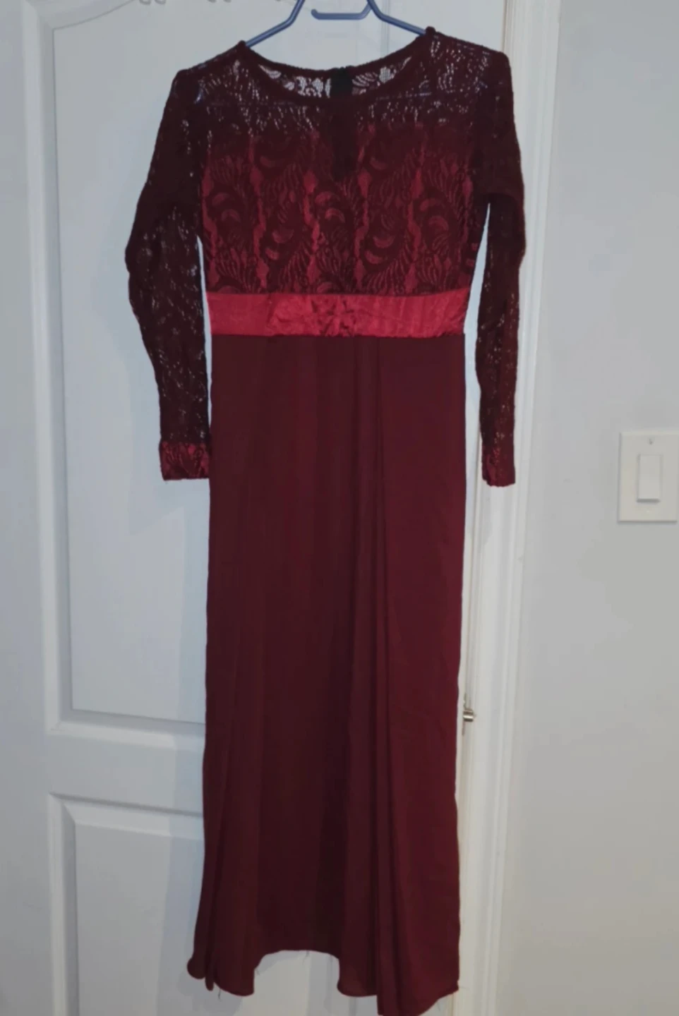 Beautiful burgundy maxi dress with long lace sleeves! It's in great condition and perfect for a special occasion. The first picture is a reference of how it might look on your body. Don't have a real tried on picture as it didn't fit me after buying so never really got to wear it lol.