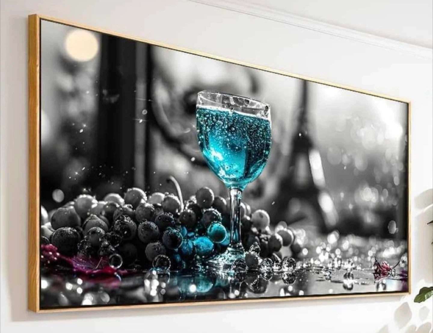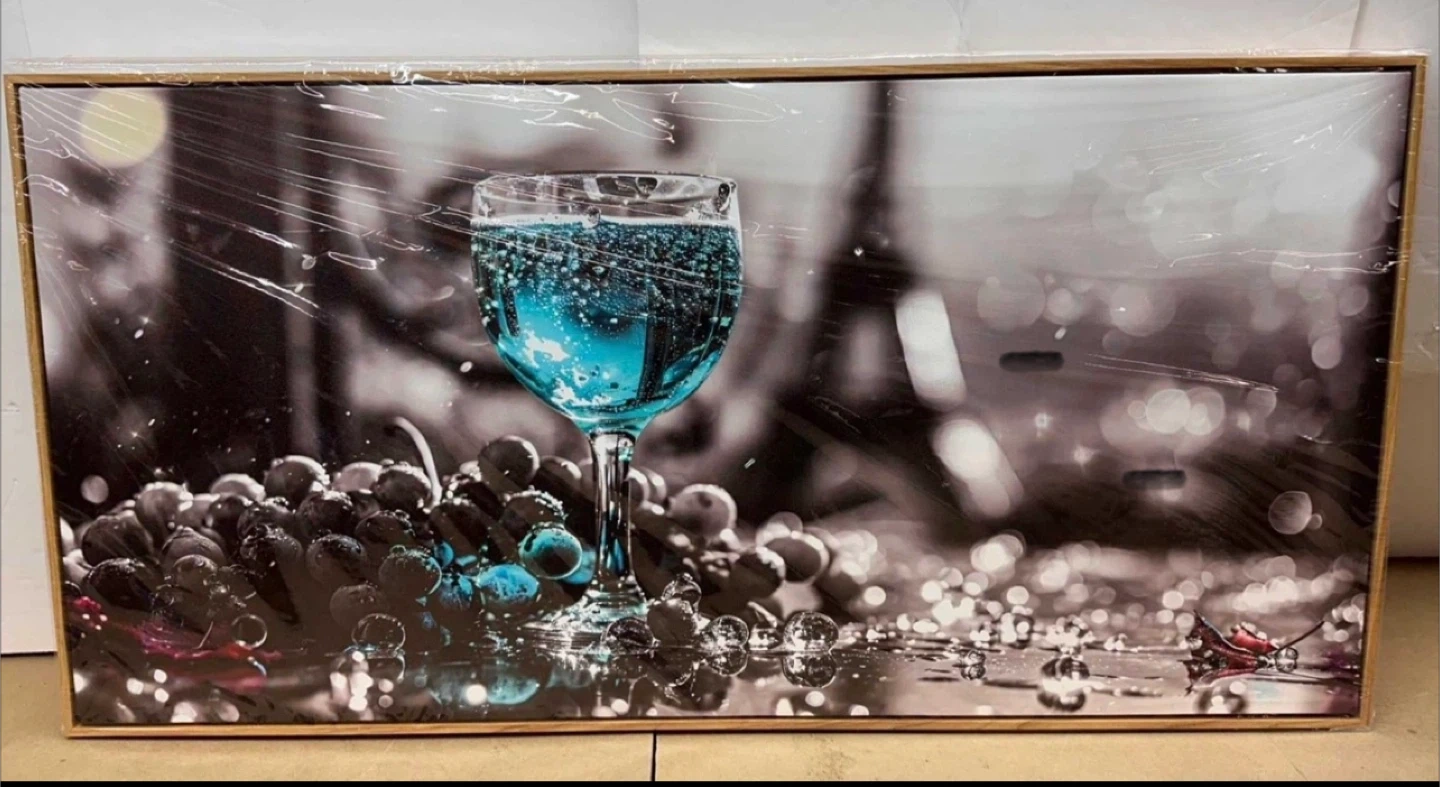 Beautiful wood framed wall art featuring a wine glass and grapes. It's a striking piece that would look great in any room!