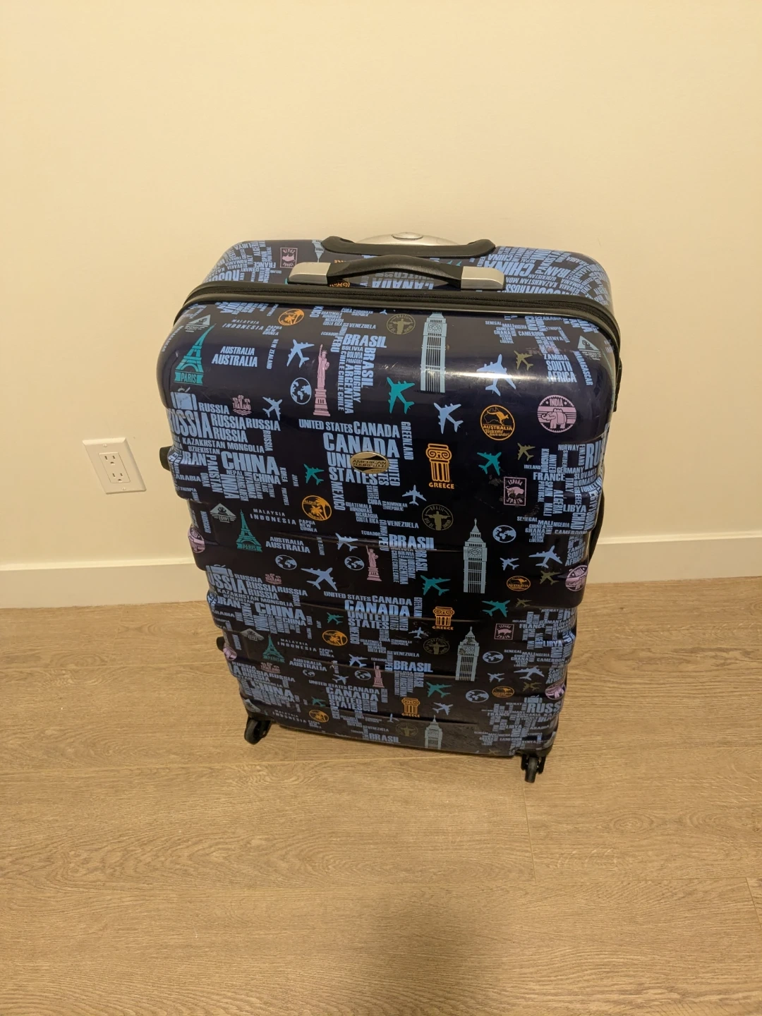 This hardside spinner suitcase features a fun world print with various countries and landmarks. It's perfect for travel and easy to maneuver with its spinner wheels. Great for your next adventure!