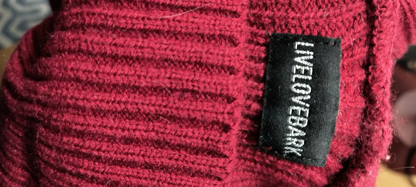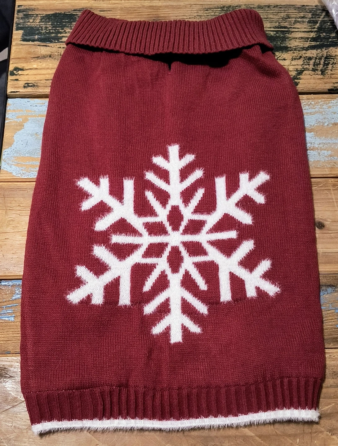 This Live Love Bark dog sweater is brand new and has never been worn! It's a size M/L with a burgundy colour and a cute snowflake design.