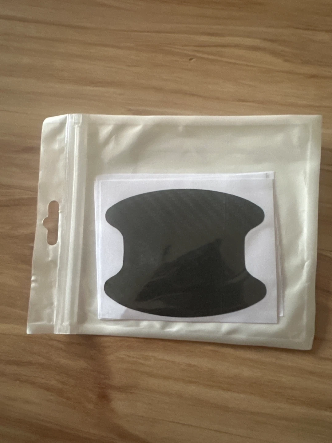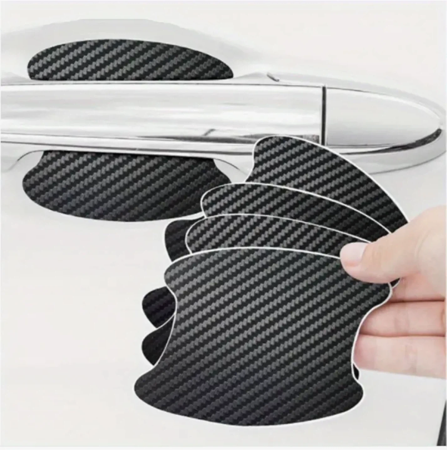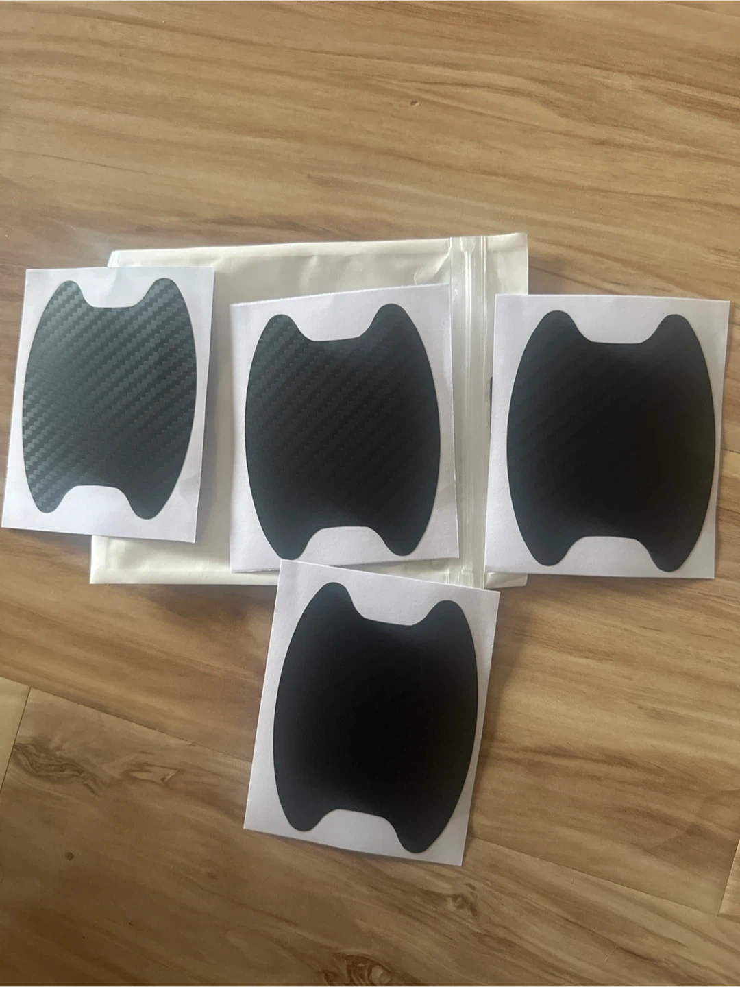 I'm selling a set of car door handle scratch protectors. They are black with a carbon fibre design. These are perfect for protecting your car's paint from scratches around the door handles. They come in a pack with multiple pieces.