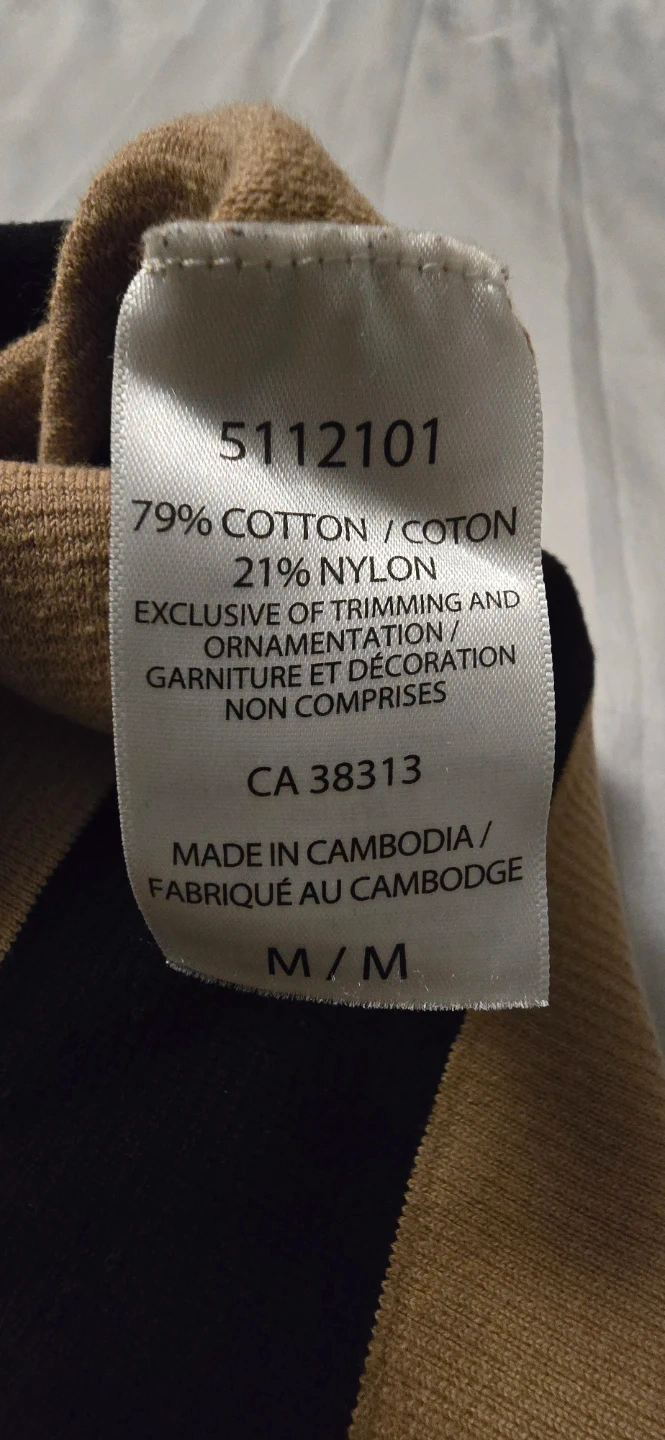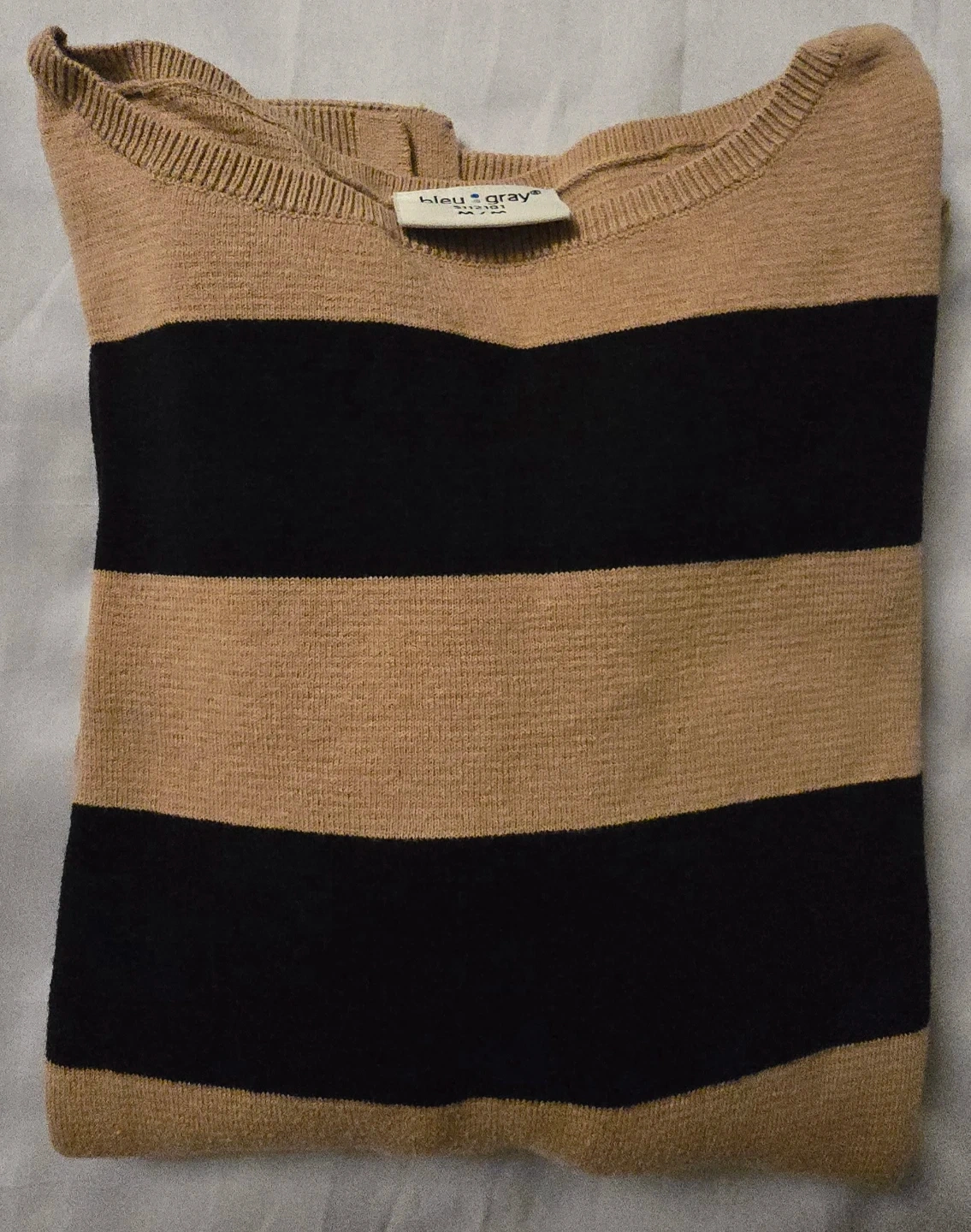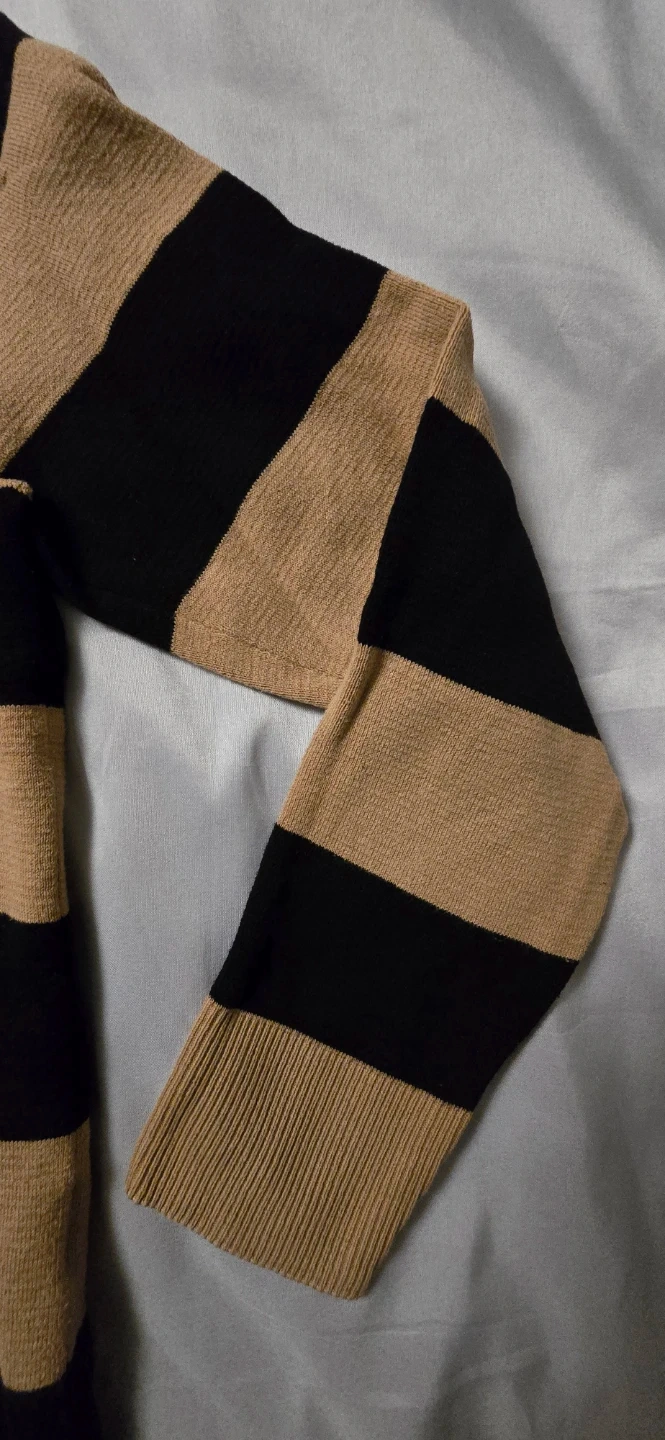 Comfy striped sweater! It's a size medium with a classic striped design in tan and black. Perfect for layering or wearing on its own!