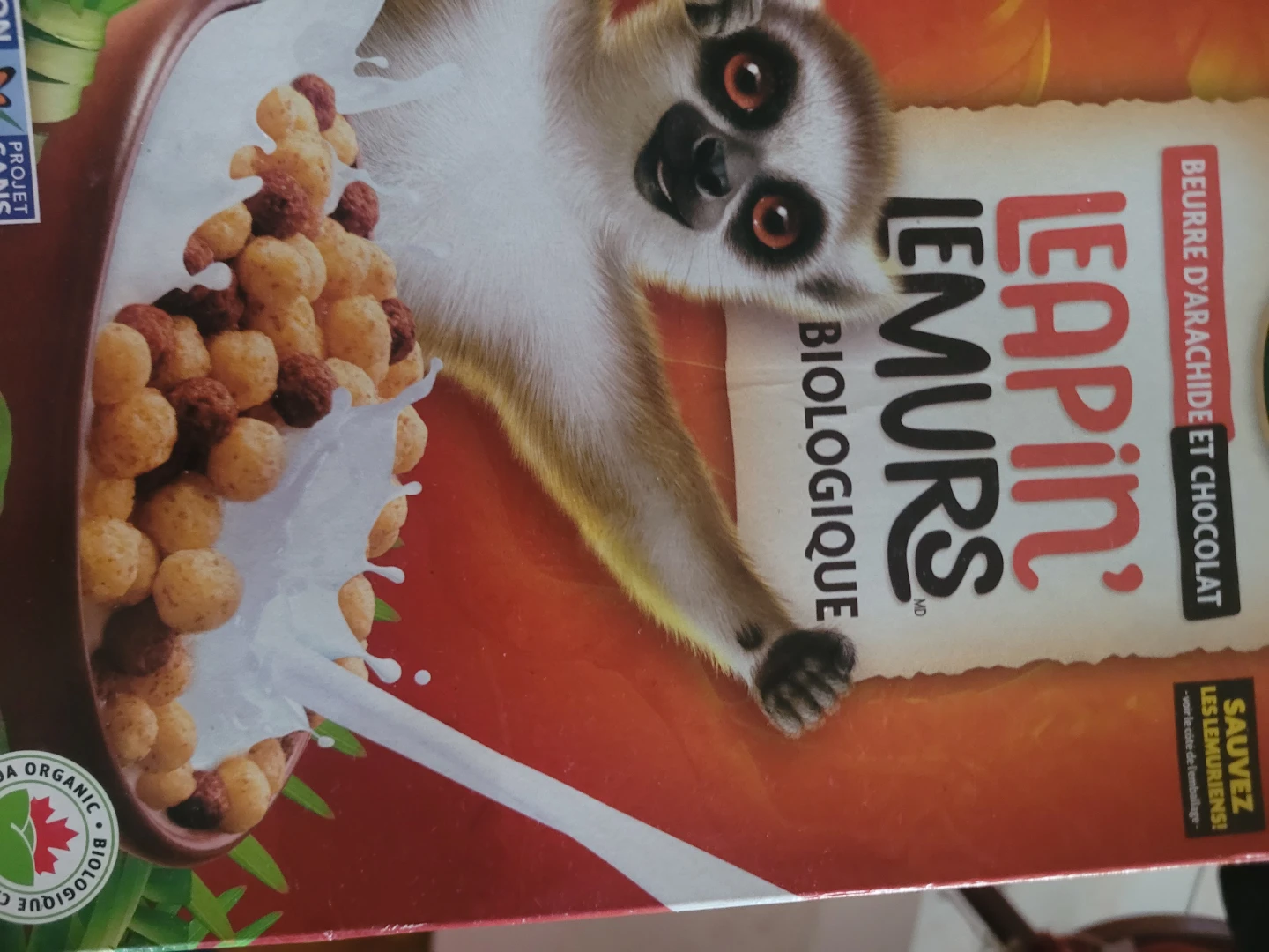 Selling a box of Leapin' Lemurs cereal, peanut butter and chocolate flavour. This is a biological cereal.