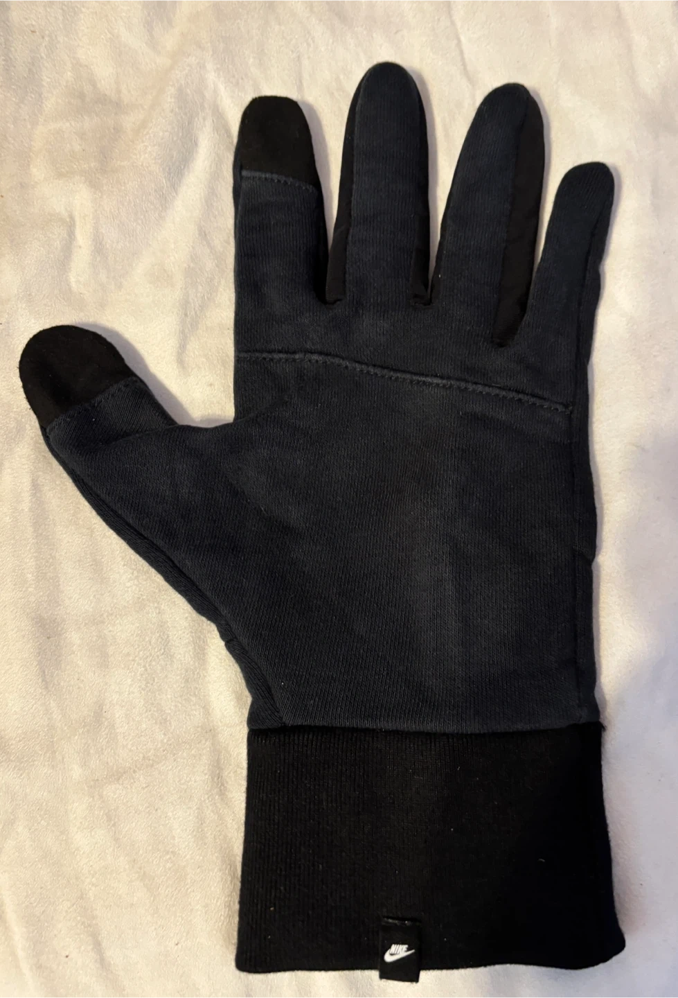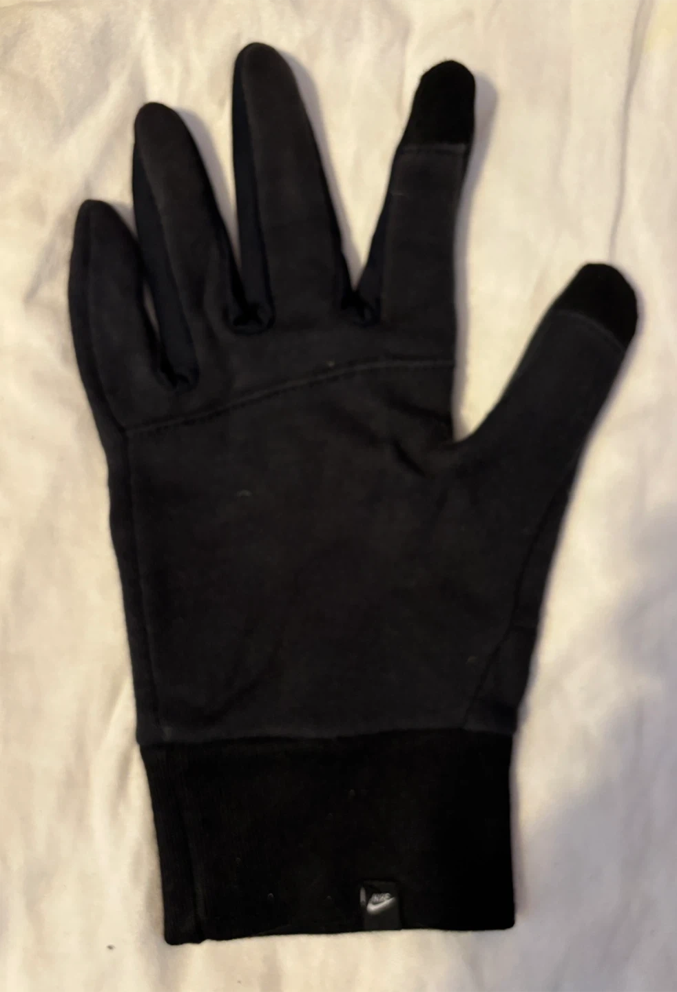 Keep your hands warm on those chilly runs with these Nike lightweight tech running gloves! They are black and size large. Slight wear colour fading due to use. The palm is made of 75% cotton and 25% polyester, while the back is 80% cotton and 20% polyester. Thumb and index fingers have tips to enable using smart phone.