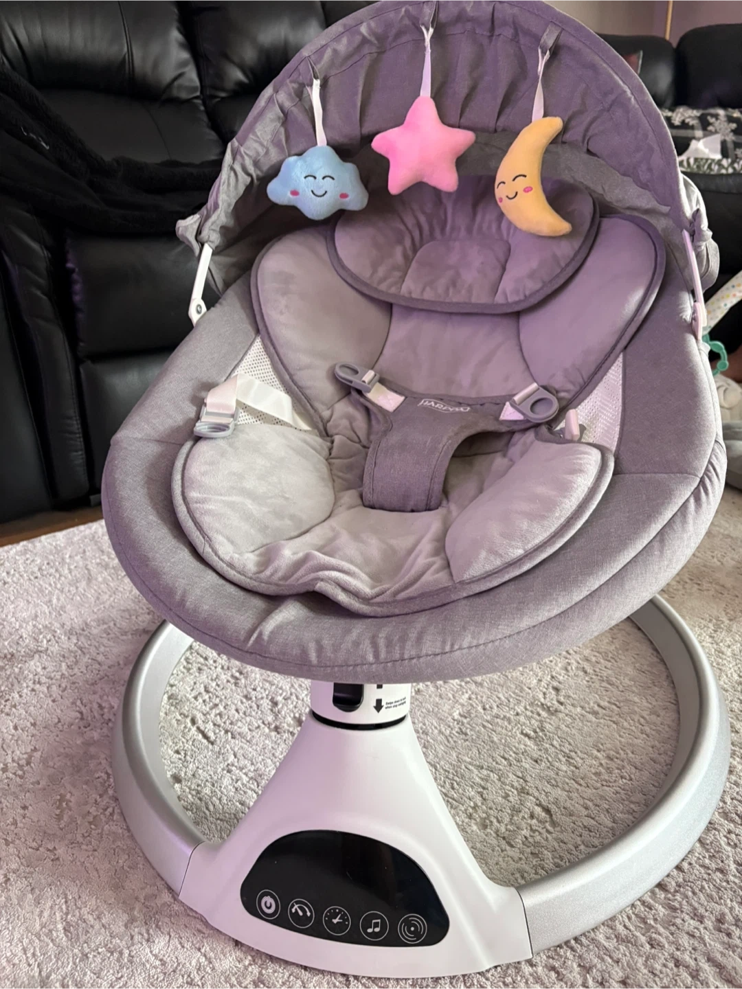 Selling electronics baby swing with a remote control in great condition! It's grey and features hanging toys for your little one to enjoy. This swing is perfect for soothing and entertaining your baby, giving you a bit of a break during the day