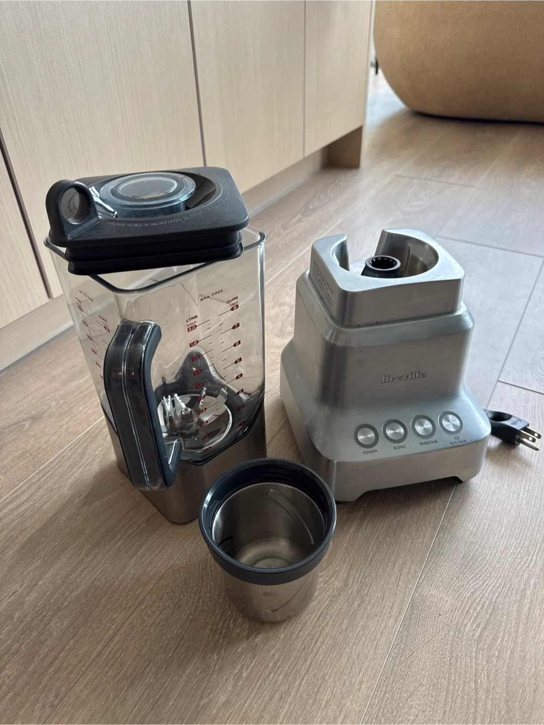 Selling a Breville blender in great condition. It comes with the pitcher and base. SMALL SILVER BLENDING CUP NOT INCLUDED. It has settings for power, blend, smoothie, and ice auto pulse.