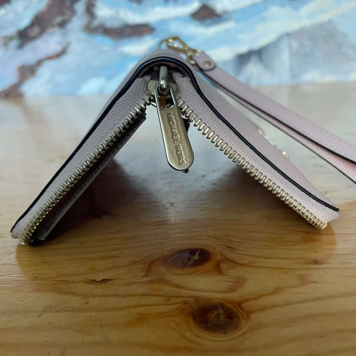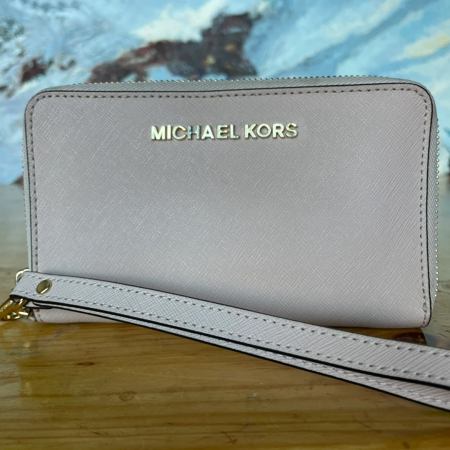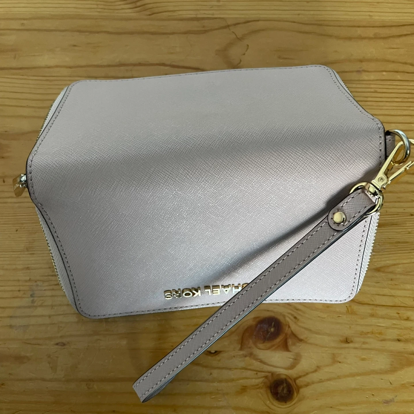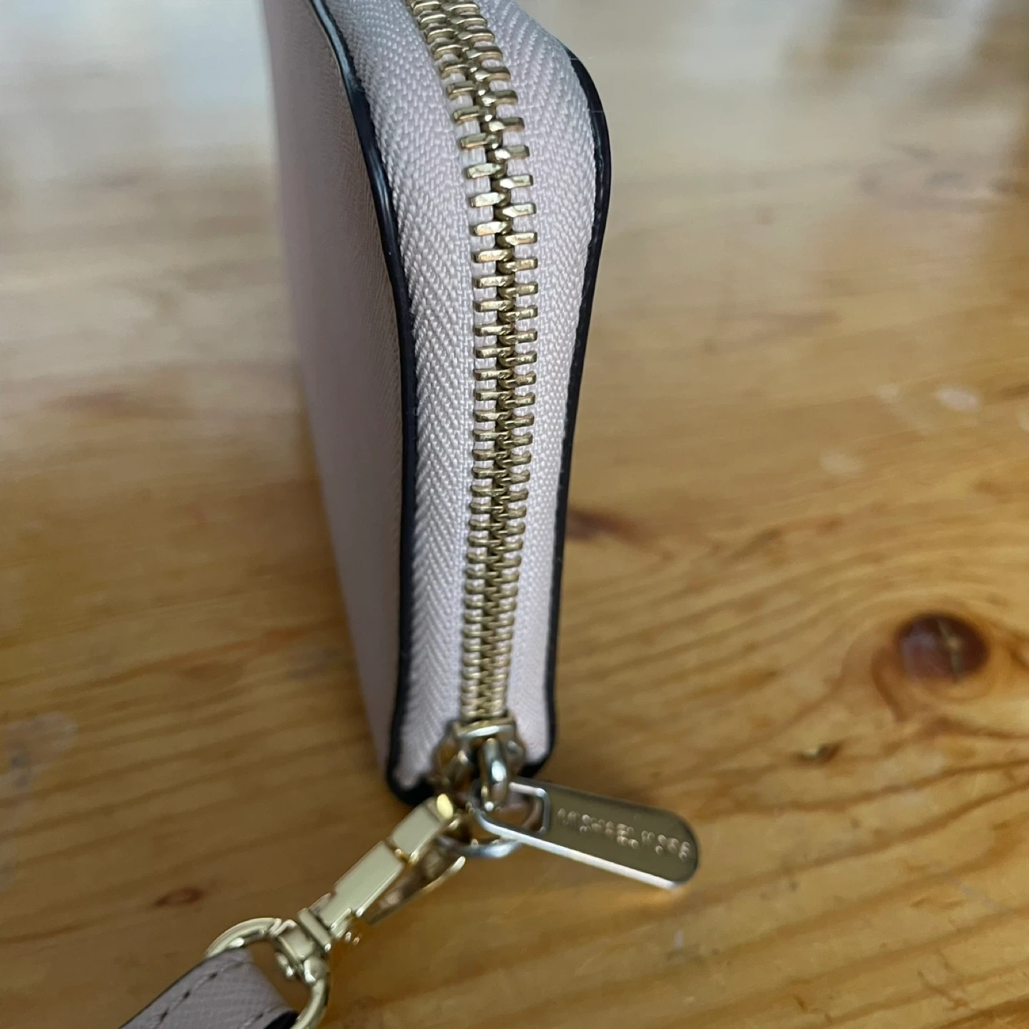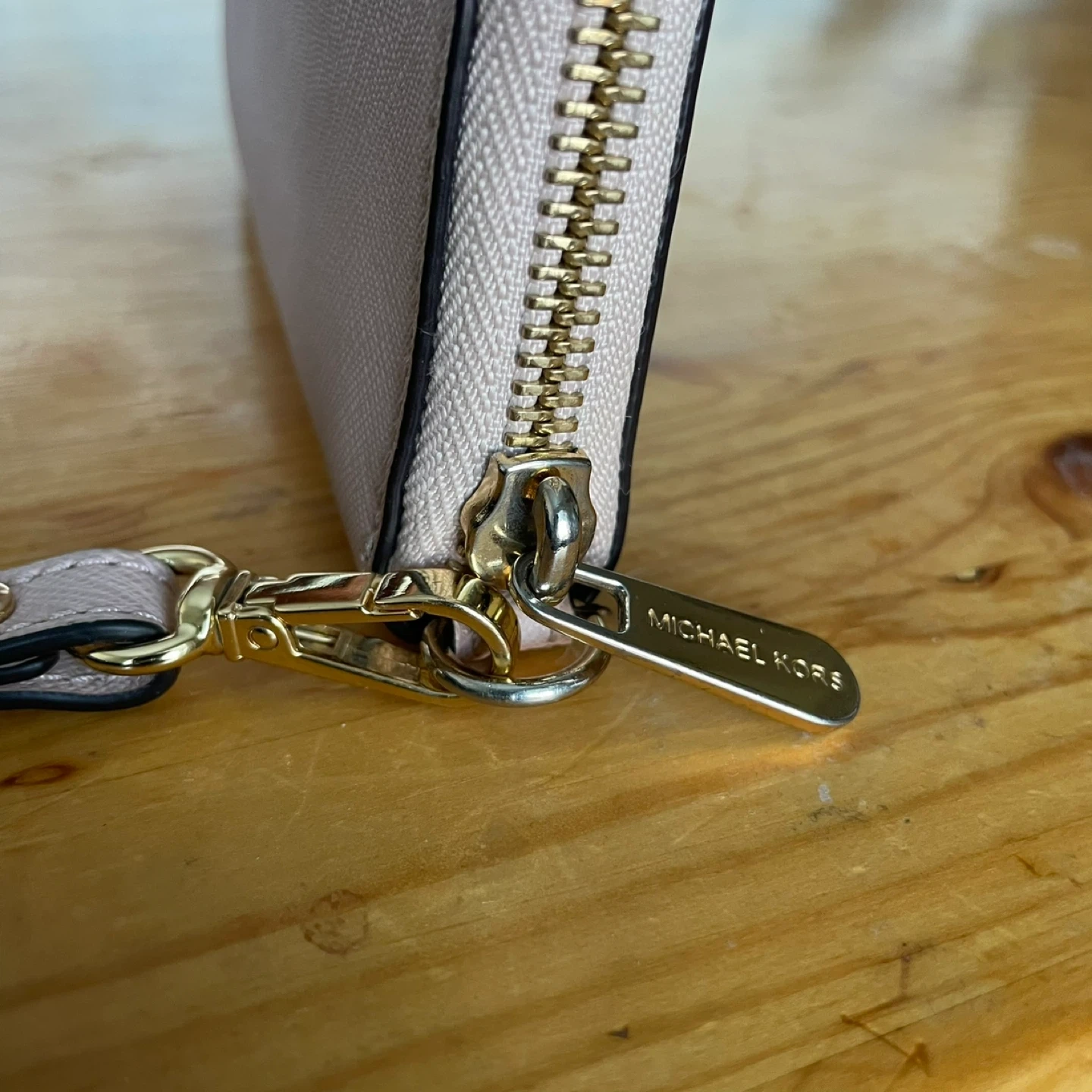 Selling a Michael Kors wallet in a light pink colour! It has a wrist strap and gold hardware. It's in great condition with lots of space for cards and cash