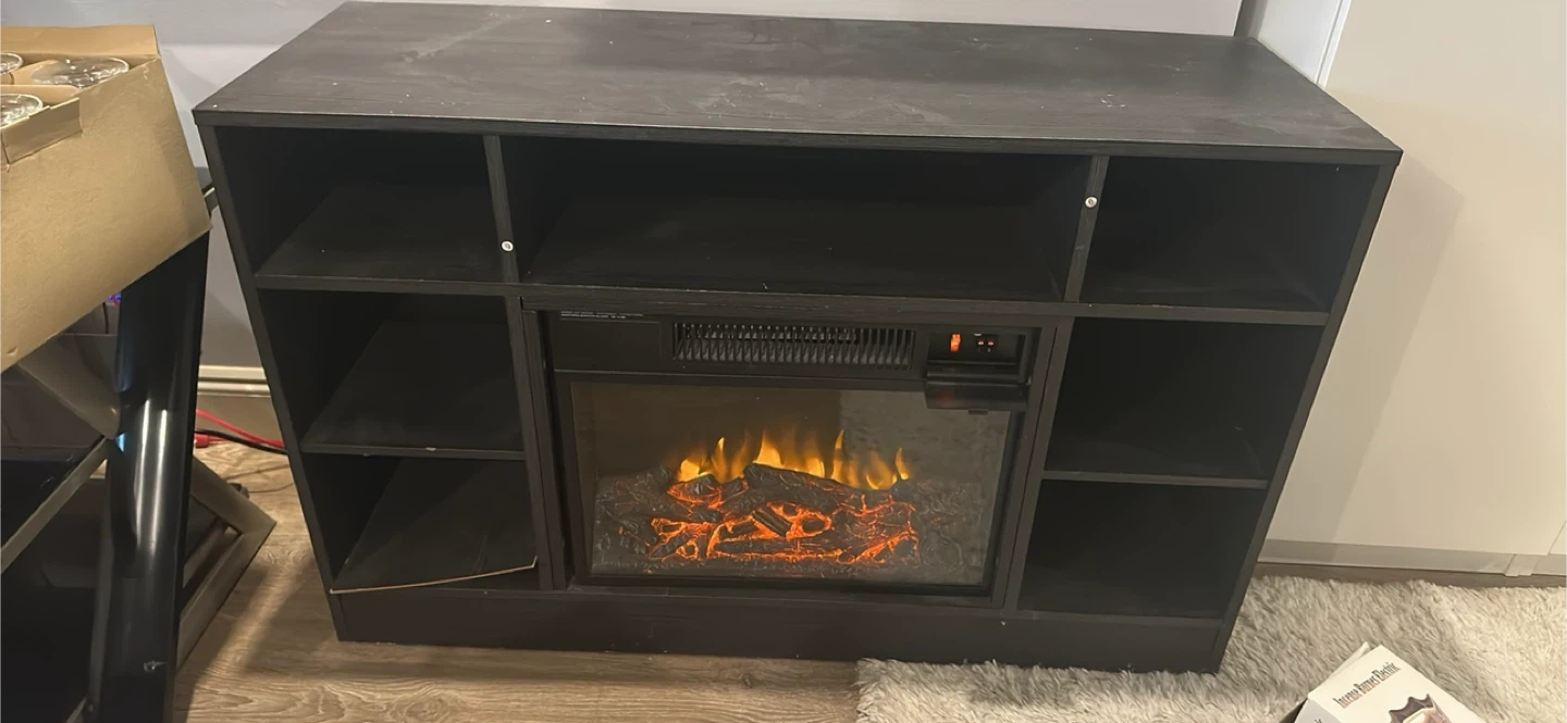 Selling a black fireplace TV stand. It has open shelving on the sides and a built-in electric fireplace in the center. Great for adding some warmth and ambiance to your living room!