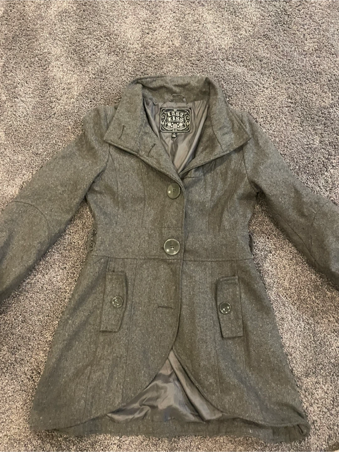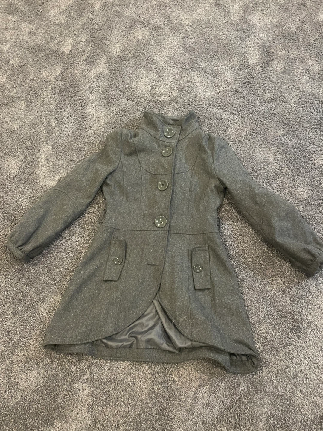 Selling a stylish coat in a lovely gray colour. It's a size medium and made from a wool blend, perfect for keeping warm. It's in great condition and ready for a new owner! Missing belt