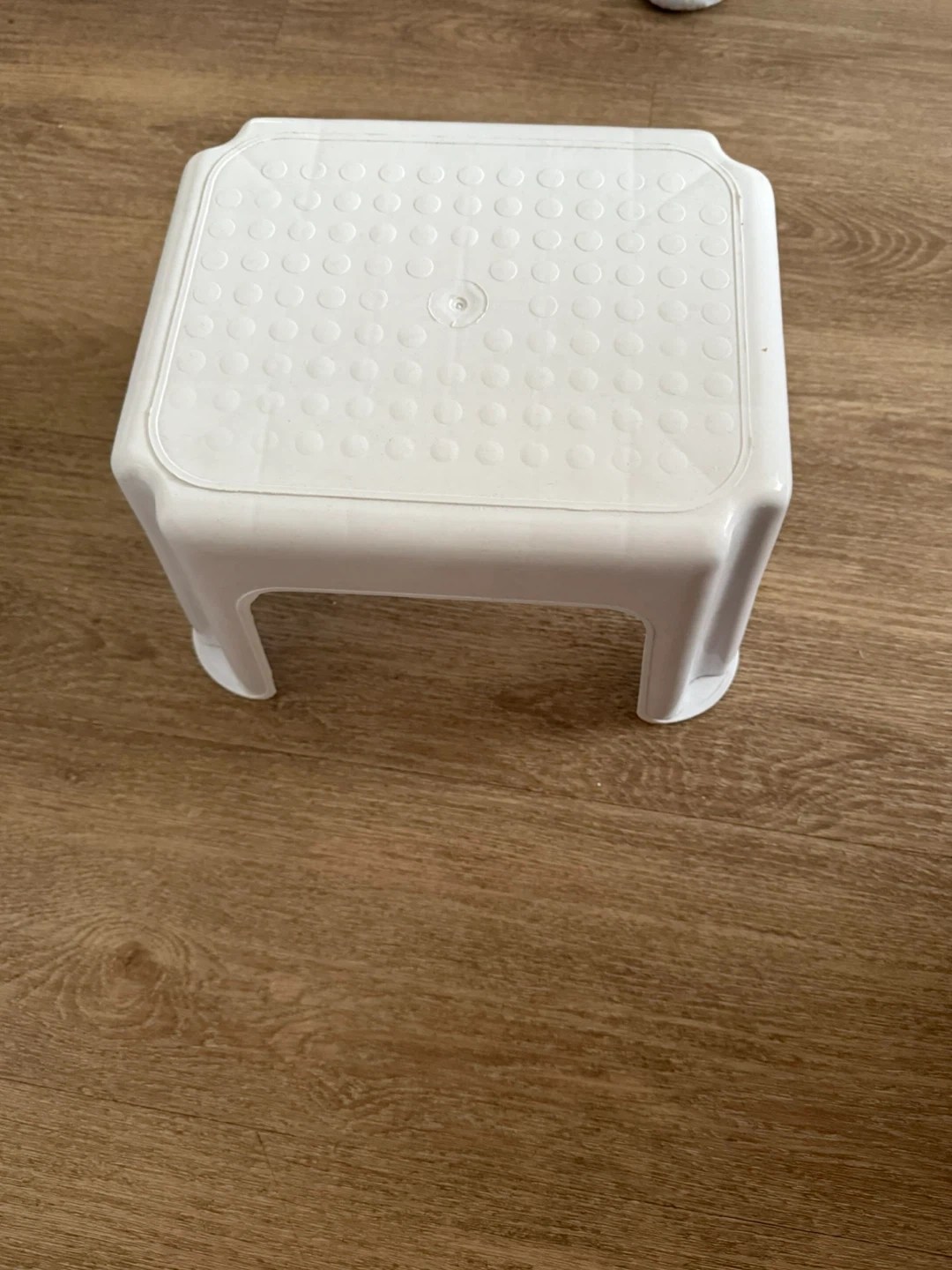 Selling a handy white plastic step stool. It's in great shape and perfect for reaching those high shelves! Great for kids or anyone who needs a little boost